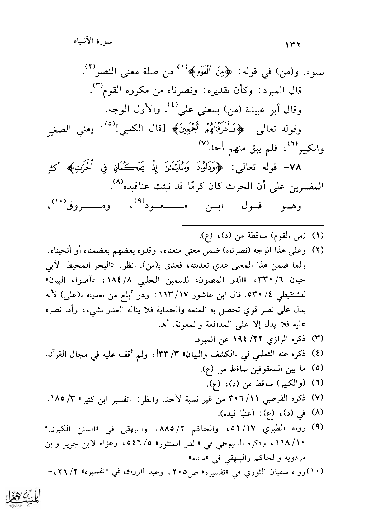 (¬2) وعلى هذا الوجه (نصرناه) ضمن معنى منعناه، وقدره بعضهم بعضمناه أو أنجيناه، ولما ضمن هذا المعنى عدي تعديته، فعدى بـ (من). انظر: "البحر المحيط" لأبي حيان 6/ 330، "الدر المصون" للسمين الحلبي 8/ 184، "أضواء البيان" للشنقيطي 4/ 530. قال ابن عاشور 17/ 113: وهو أبلغ من تعديته بـ (على) لأنه يدل على نصر قوي تحصل به المنعة والحماية فلا يناله العدو بشيء، وأما نصره عليه فلا يدل إلا على المدافعة والمعونة. أهـ.