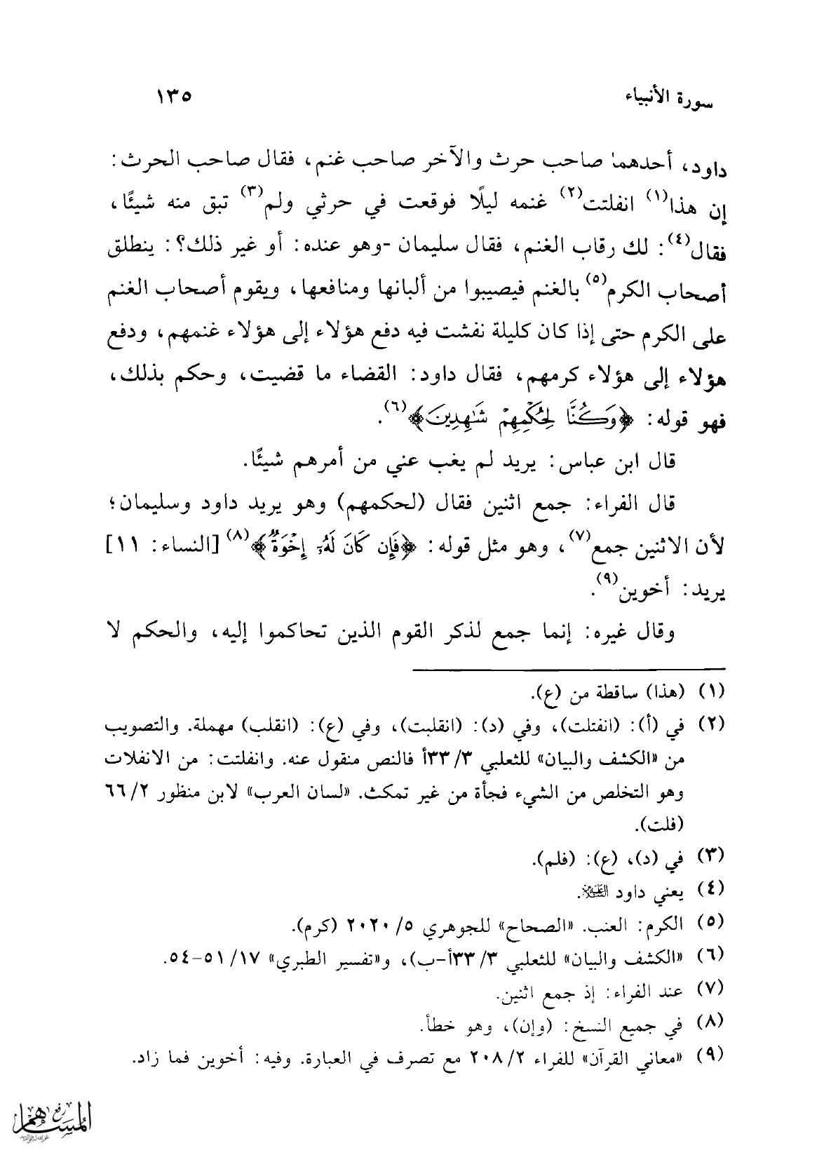 داود، أحدهما صاحب حرث والآخر صاحب غنم، فقال صاحب الحرث: إن هذا (¬1) أنفلتت (¬2) غنمه ليلاً فوقعت في حرثي ولم (¬3) تبق منه شيئًا، فقال (¬4): لك رقاب الغنم، فقال سليمان -وهو عنده: أو غير ذلك؟: ينطلق أصاب الكرم (¬5) بالغنم فيصيبوا من ألبانها ومنافعها، ويقوم أصحاب الغنم على الكرم حتى إذا كان كليلة نفشت فيه دفع هؤلاء إلى هؤلاء غنمهم، ودفع هؤلاء إلى هؤلاء كرمهم، فقال داود: القضاء ما قضيت، وحكم بذلك، فهو قوله: {وَكُنَّا لِحُكْمِهِمْ شَاهِدِينَ} (¬6).