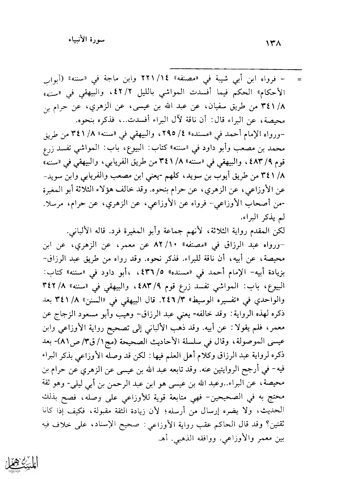-ورواه عبد الرزاق في "مصنفه" 10/ 82 عن معمر، عن الزهري، عن ابن محيصة، عن أبيه، أن ناقة للبراء. فذكر نحوه. وقد رواه من طريق عبد الرزاق - بزيادة أبيه- الإمام أحمد في "مسنده" 5/ 436،، أبو داود في "سننه" كتاب: البيوع، باب: المواشي تفسد زرع قوم 9/ 483، والبيهقي في "سننه" 8/ 342 والواحدي في "تفسيره الوسيط" 3/ 246. قال البيهقي في "السنن" 8/ 341 بعد ذكره لهذه الرواية: وقد خالفه -يعني عبد الرزاق- وهيب وأبو مسعود الزجاج عن معمر، فلم يقولا: عن أبيه. وقد ذهب الألباني إلى تصحيح رواية الأوزاعي وابن عيسى الموصولة، وقال في سلسلة الأحاديث الصحيحة (مج 1/ ق 3/ ص 81) -بعد ذكره لرواية عبد الرزاق وكلام أهل العلم فيها: لكن قد وصله الأوزاعي بذكر البراء فيه- في أرجح الروايتين عنه. وقد تابعه عبد الله بن عيسى عن الزهري عن حرام بن محيصة، عن البراء .. وعبد الله بن عيسى وابن عبد الرحمن بن أبي ليلى -وهو ثقة محتج به في الصحيحين- فهي متابعة قوية للأوزاعي على وصله، فصح بذلك الحديث، ولا يضره إرسال من أرسله؛ لأن زيادة الشاقة مقبولة، فكيف إذا كانا ثقتين؟ وقد قال الحاكم عقب رواية الأوزاعي: صحح الإسناد، على خلاف فيه بين معمر والأوزاعي. ووافقه الذهبي. أهـ