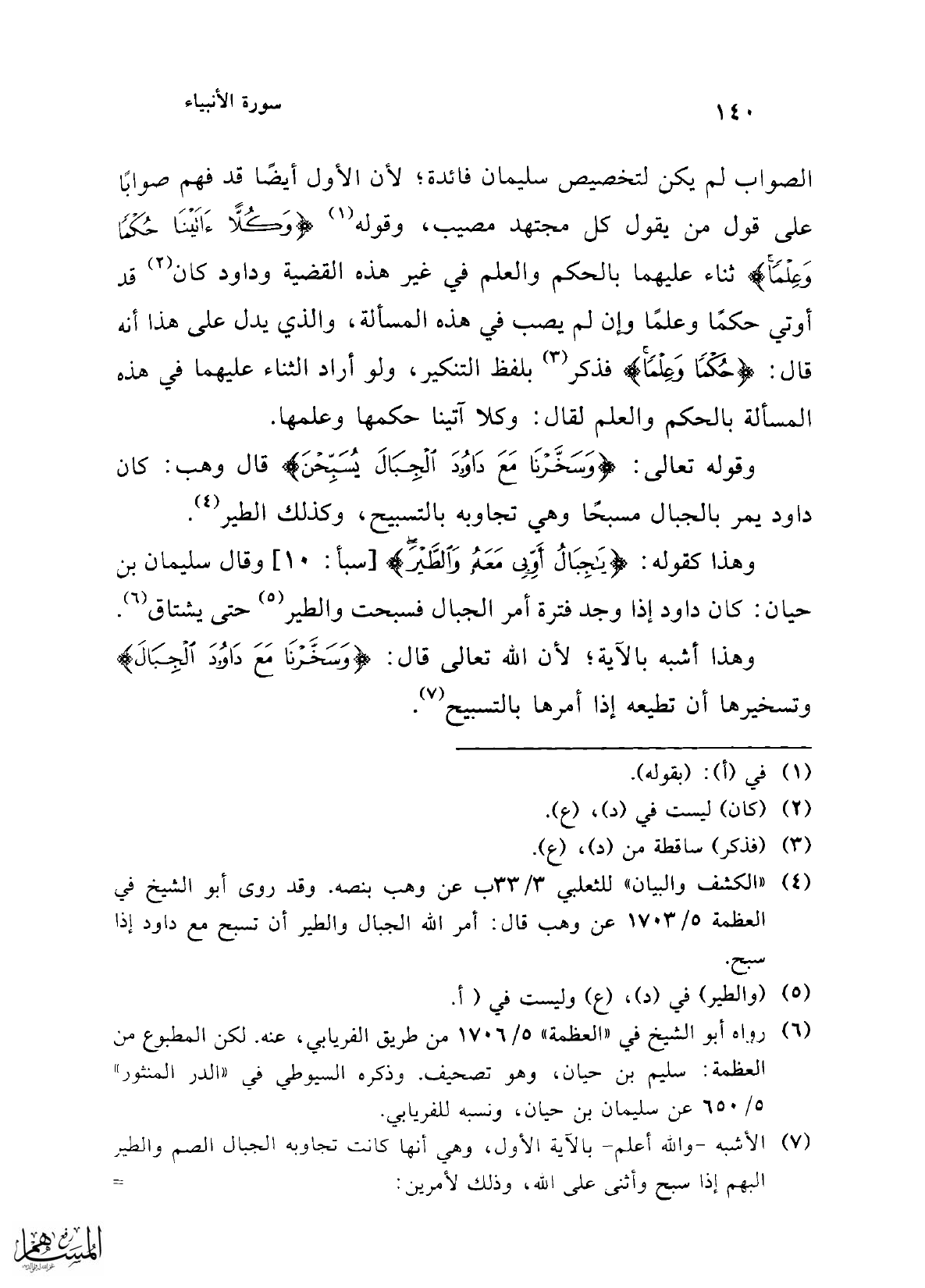 وهذا أشبه بالآية؛ لأن الله تعالى قال: {وَسَخَّرْنَا مَعَ دَاوُودَ الْجِبَالَ} وتسخيرها أن تطيعه إذا أمرها بالتسبيح (¬7).