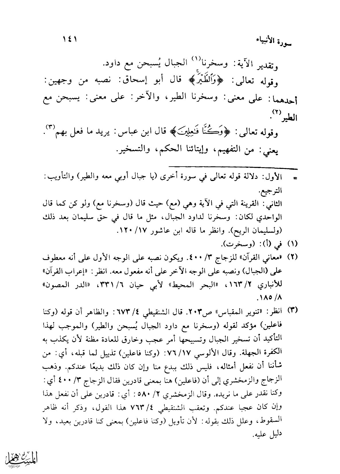 الثاني: القرينة التي في الآية وهي (مع) حيث قال (وسخرنا مع) ولو كن كما قال الواحدي لكان: وسخرنا لداود الجبال، مثل ما قال في حق سليمان بعد ذلك (ولسليمان الريح). وانظر ما قاله ابن عاشور 17/ 120.