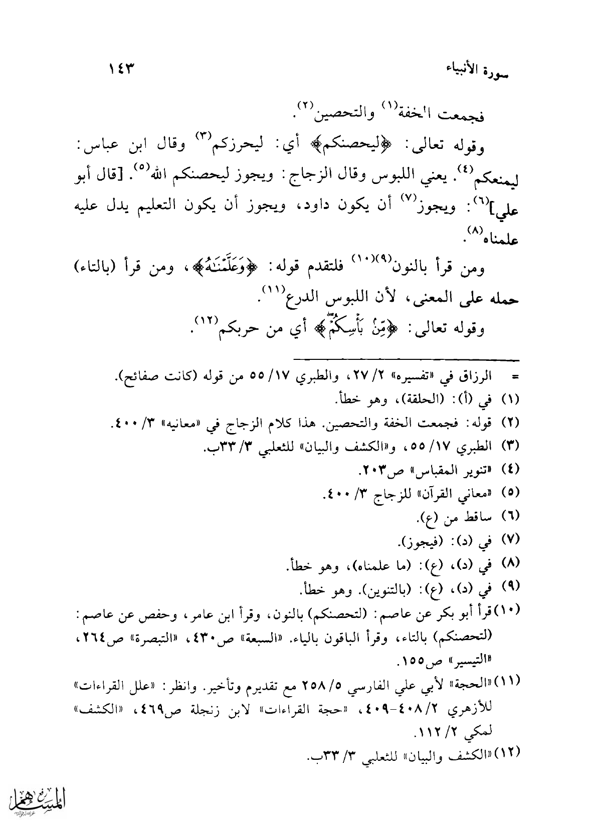 ومن قرأ بالنون (¬9) (¬10) فلتقدم قوله: {وَعَلَّمْنَاهُ}، ومن قرأ (بالتاء) حمله على المعنى؛ لأن اللبوس الدرع (¬11).