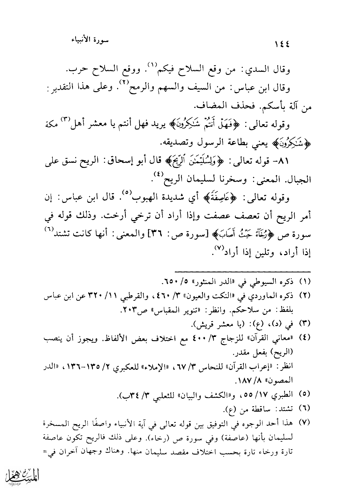 (¬7) هذا أحد الوجوه في التوفيق بين قوله تعالى في آية الأنبياء واصفًا الريح المسخرة لسليمان بأنها (عاصفة) وفي سورة ص (رخاء). وعلى ذلك فالريح تكون عاصفة تارة ورخاء تارة بحسب اختلاف مقصد سليمان منها. وهناك وجهان آخران في =