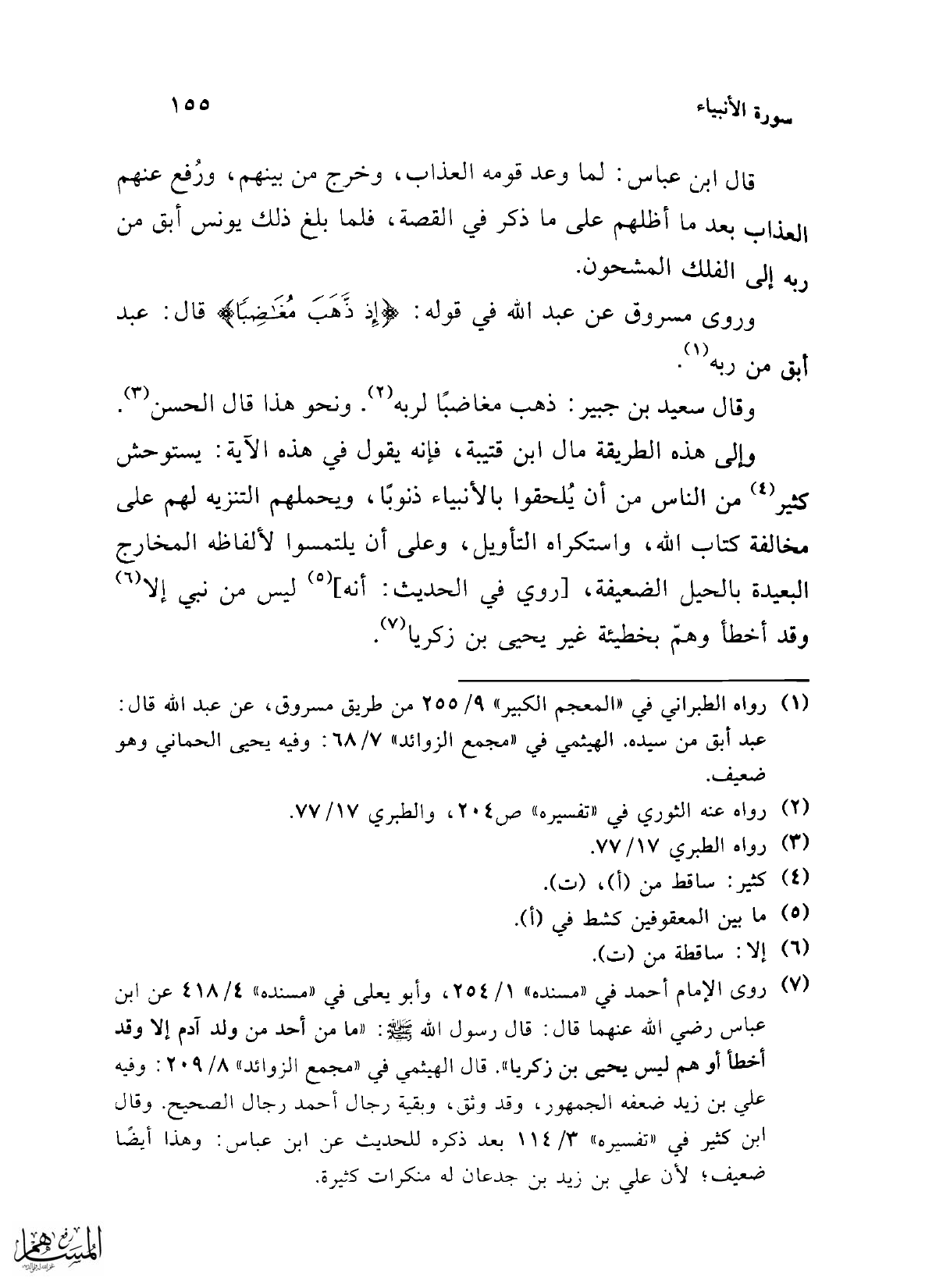 (¬7) روى الإمام أحمد في "مسنده" 1/ 254، وأبو يعلى في "مسنده" 4/ 418 عن ابن عباس رضي الله عنهما قال: قال رسول الله -صلى الله عليه وسلم-: "ما من أحد من ولد آدم إلا وقد أخطأ أو هم ليس يحيى بن زكريا". قال الهيثمي في "مجمع الزوائد" 8/ 209: وفيه علي بن زيد ضعفه الجمهور، وقد وثق، وبقية رجال أحمد رجال الصحيح. وقال ابن كثير في "تفسيره" 3/ 114 بعد ذكره للحديث عن ابن عباس: وهذا أيضًا ضعيف؛ لأن علي بن زيد بن جدعان له منكرات كثيرة.