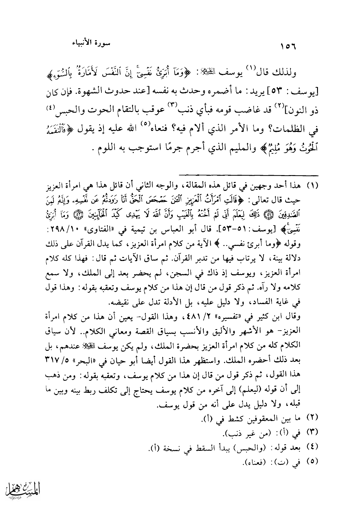 (¬1) هذا أحد وجهين في قائل هذه المقالة، والوجه الثاني أن قائل هذا هي امرأة العزيز حيث قال تعالى: {قَالَتِ امْرَأَتُ الْعَزِيزِ الْآنَ حَصْحَصَ الْحَقُّ أَنَا رَاوَدْتُهُ عَنْ نَفْسِهِ وَإِنَّهُ لَمِنَ الصَّادِقِينَ (51) ذَلِكَ لِيَعْلَمَ أَنِّي لَمْ أَخُنْهُ بِالْغَيْبِ وَأَنَّ اللَّهَ لَا يَهْدِي كَيْدَ الْخَائِنِينَ (52) وَمَا أُبَرِّئُ نَفْسِي} [يوسف: 51 - 53]. قال أبو العباس بن تيمية في "الفتاوى" 10/ 298: وقوله {وَمَا أُبَرِّئُ نَفْسِي ...} الآية من كلام امرأة العزيز، كما يدل القرآن على ذلك دلالة بينة، لا يرتاب فيها من تدبر القرآن. ثم ساق الآيات ثم قال: فهذا كله كلام امرأة العزيز، ويوسف إذ ذاك في السجن، لم يحضر بعد إلى الملك، ولا سمع كلامه ولا رآه. ثم ذكر قول من قال إن هذا من كلام يوسف وتعقبه بقوله: وهذا قول في غاية الفساد، ولا دليل عليه، بل الأدلة تدل على نقيضه.