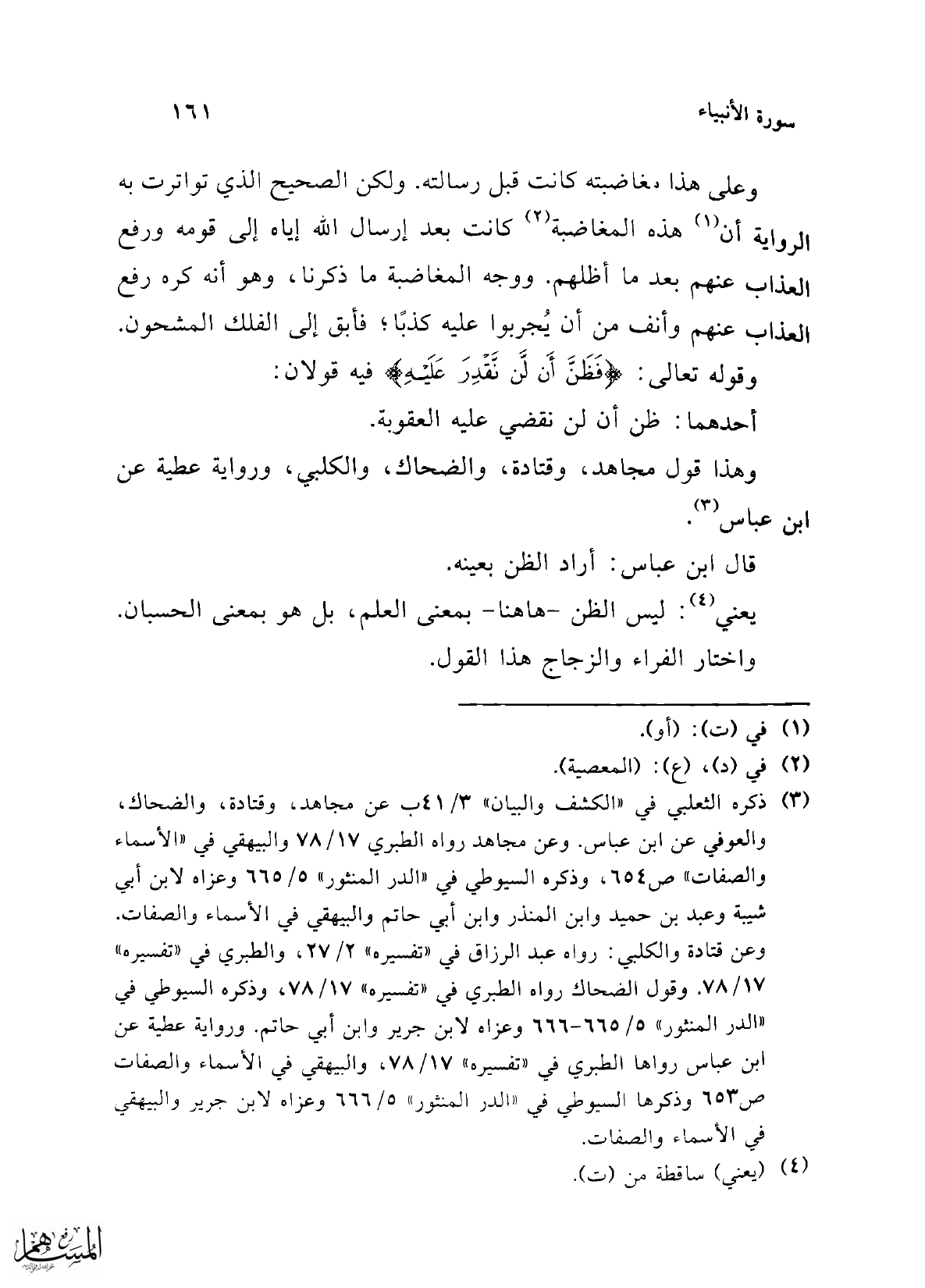 (¬3) ذكره الثعلبي في "الكشف والبيان" 3/ 41 ب عن مجاهد، وقتادة، والضحاك، والعوفي عن ابن عباس. وعن مجاهد رواه الطبري 17/ 78 والبيهقي في "الأسماء والصفات" ص 654، وذكره السيوطي في "الدر المنثور" 5/ 665 وعزاه لابن أبي شيبة وعبد بن حميد وابن المنذر وابن أبي حاتم والبيهقي في الأسماء والصفات. وعن قتادة والكلبي: رواه عبد الرزاق في "تفسيره" 2/ 27، والطبري في "تفسيره" 17/ 78. وقول الضحاك رواه الطبري في "تفسيره" 17/ 78، وذكره السيوطي في "الدر المنثور" 5/ 665 - 666 وعزاه لابن جرير وابن أبي حاتم. ورواية عطية عن ابن عباس رواها الطبري في "تفسيره" 17/ 78، والبيهقي في الأسماء والصفات ص 653 وذكرها السيوطي في "الدر المنثور" 5/ 666 وعزاه لابن جرير والبيهقي في الأسماء والصفات.