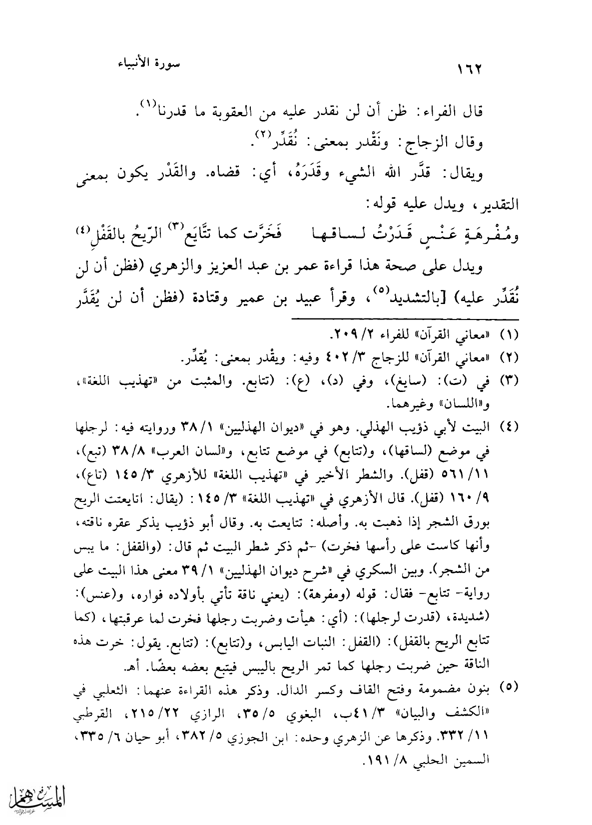 ويدل على صحة هذا قراءة عمر بن عبد العزيز والزهري (فظن أن لن نُقَدِّر عليه) [بالتشديد (¬5)، وقرأ عبيد بن عمير وقتادة (فظن أن لن يُقَدَّر