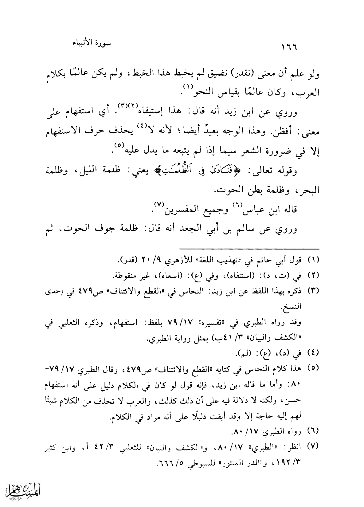 (¬5) هذا كلام النحاس في كتابه "القطع والائتناف" ص 479، وقال الطبري 17/ 79 - 80: وأما ما قاله ابن زيد، فإنه قول لو كان في الكلام دليل على أنه استفهام حسن، ولكنه لا دلالة فيه على أن ذلك كذلك، والعرب لا تحذف من الكلام شيئًا لهم إليه حاجة إلا وقد أبقت دليلًا على أنه مراد في الكلام.