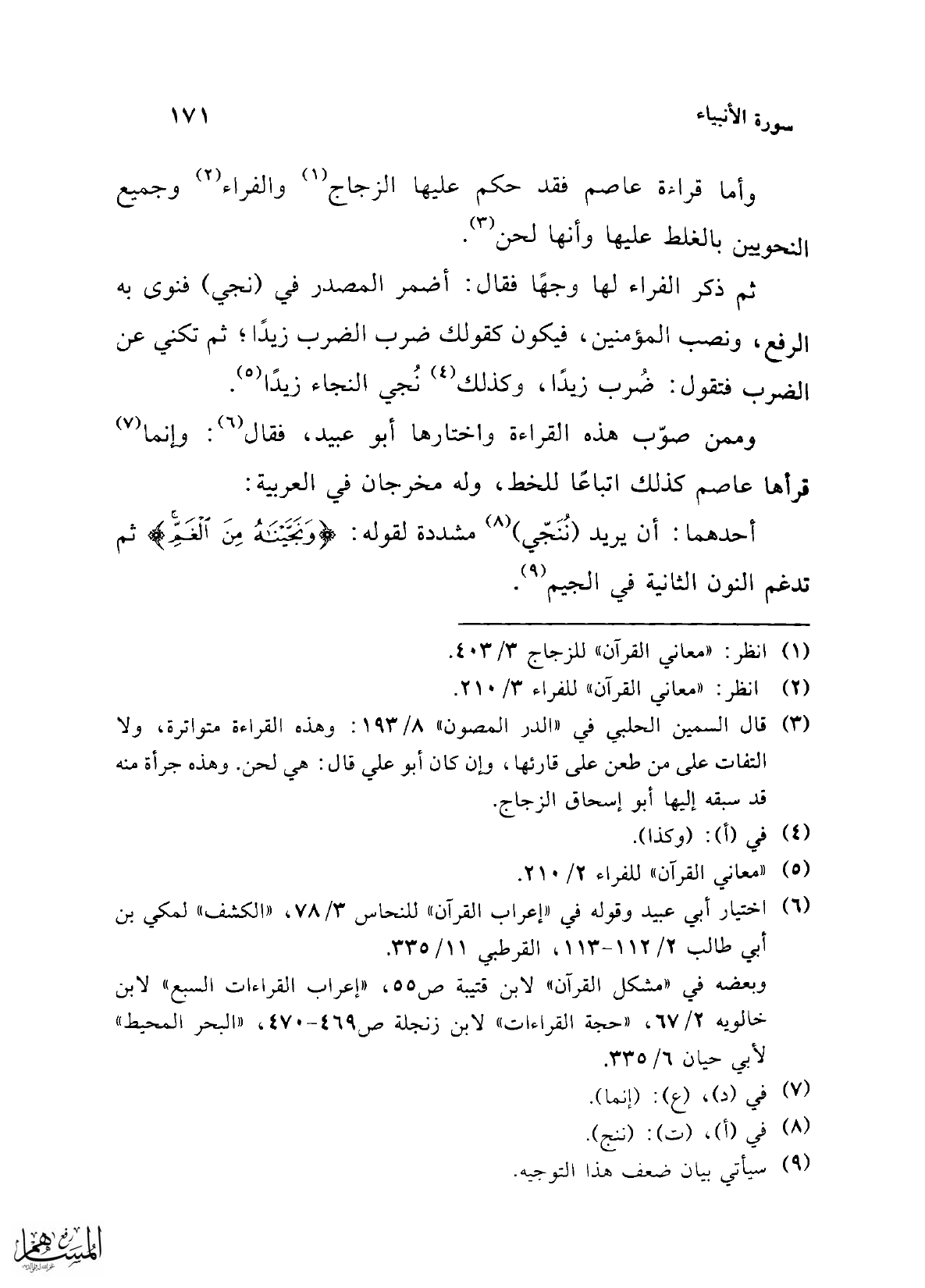 ثم ذكر الفراء لها وجهًا فقال: أضمر المصدر في (بني) فنوى به الرفع، ونصب المؤمنين، فيكون كقولك ضرب الضرب زيدًا؛ ثم تكني عن أنْضرب فتقول: ضُرب زيدًا، وكذلك (¬4) نُجي النجاء زيدًا (¬5).