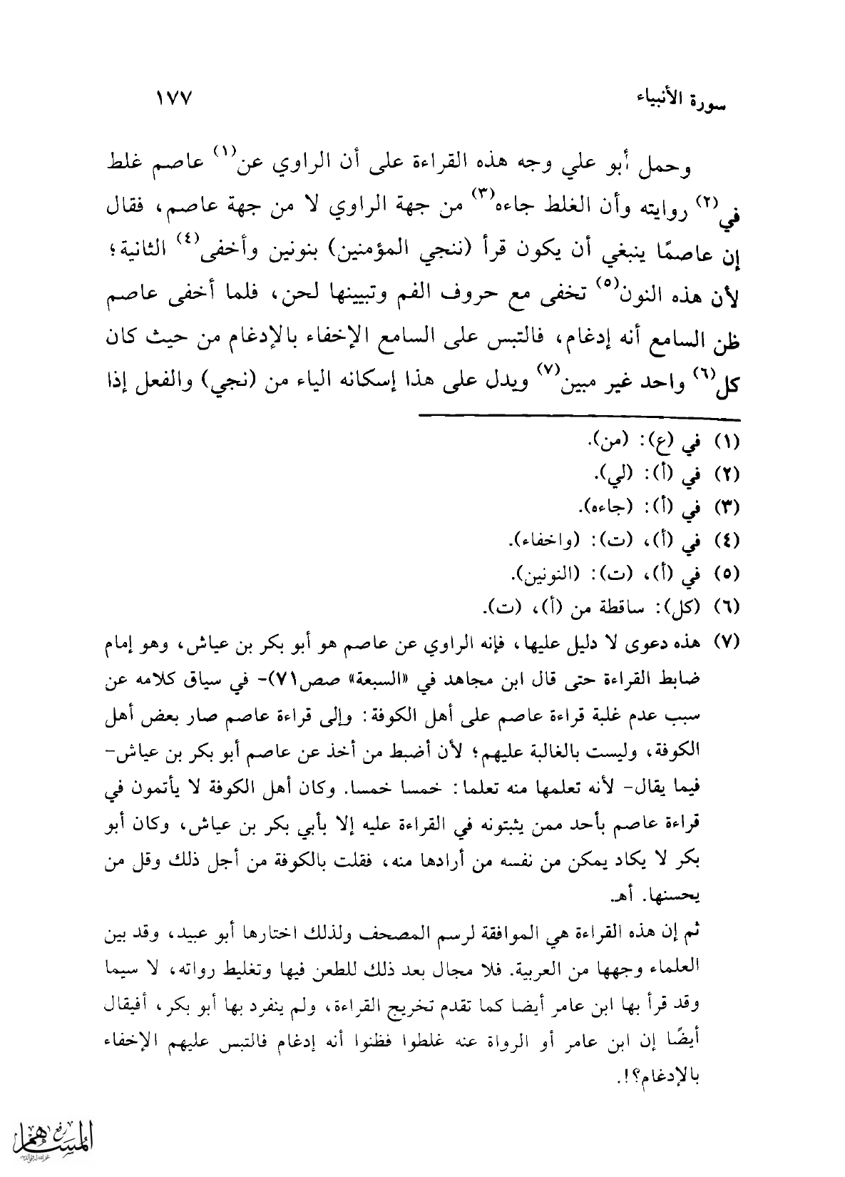 وحمل أبو علي وجه هذه القراءة على أن الراوي عن (¬1) عاصم غلط في (¬2) روايته وأن الغلط جاءه (¬3) من جهة الراوي لا من جهة عاصم، فقال إن عاصمًا ينبغي أن يكون قرأ (ننجي المؤمنين) بنونين وأخفى (¬4) الثانية؛ لأن هذه النون (¬5) تخفى مع حروف الفم وتبيينها لحن، فلما أخفى عاصم ظن السامع أنه إدغام، فالتبس على السامع الإخفاء بالإدغام من حيث كان كل (¬6) واحد غير مبين (¬7) ويدل على هذا إسكانه الياء من (نجي) والفعل إذا