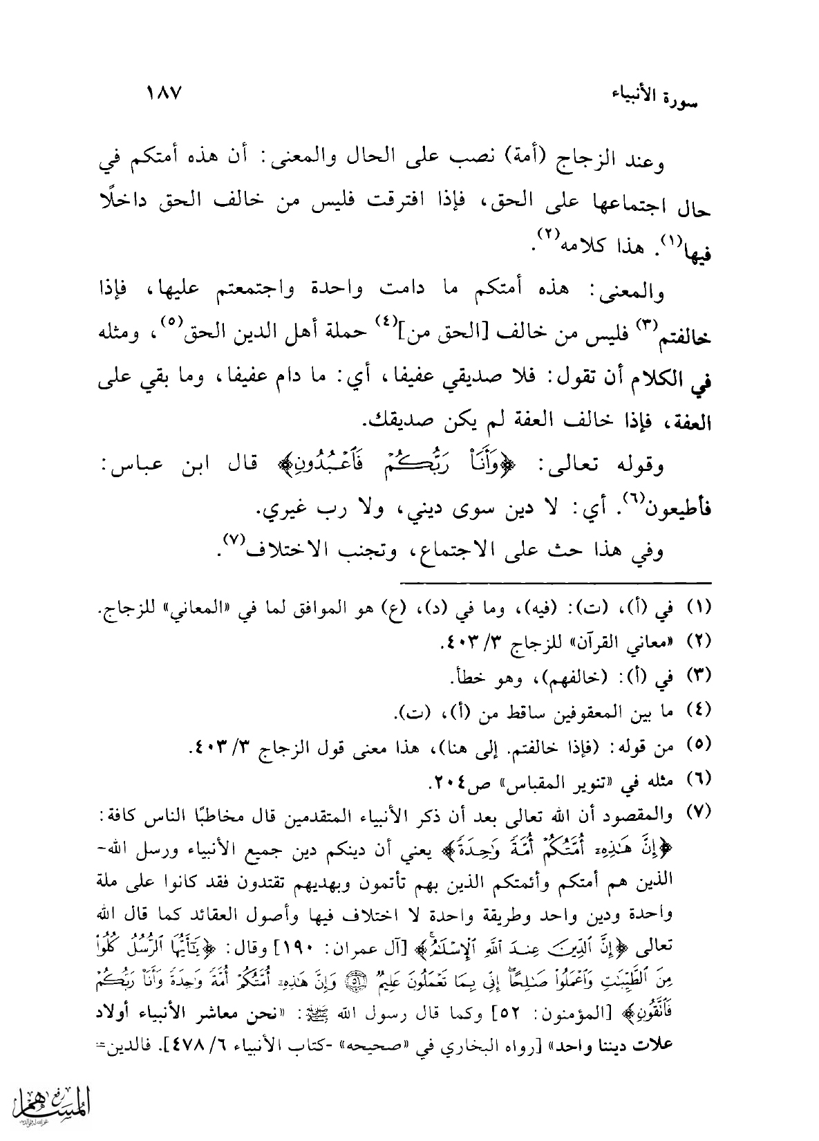(¬7) والمقصود أن الله تعالى بعد أن ذكر الأنبياء المتقدمين قال مخاطبًا الناس كافة: {إِنَّ هَذِهِ أُمَّتُكُمْ أُمَّةً وَاحِدَةً} يعني أن دينكم دين جميع الأنبياء ورسل الله- الذين هم أمتكم وأئمتكم الذين بهم تأتمون وبهديهم تقتدون فقد كانوا على ملة واحدة ودين واحد وطريقة واحدة لا اختلاف فيها وأصول العقائد كما قال الله تعالى {إِنَّ الدِّينَ عِنْدَ اللَّهِ الْإِسْلَامُ} [آل عمران: 19] وقال: {يَا أَيُّهَا الرُّسُلُ كُلُوا مِنَ الطَّيِّبَاتِ وَاعْمَلُوا صَالِحًا إِنِّي بِمَا تَعْمَلُونَ عَلِيمٌ (51) وَإِنَّ هَذِهِ أُمَّتُكُمْ أُمَّةً وَاحِدَةً وَأَنَا رَبُّكُمْ فَاتَّقُونِ} [المؤمنون: 52] وكما قال رسول الله -صلى الله عليه وسلم-: "نحن معاشر الأنبياء أولاد علات ديننا واحد" [رواه البخاري في "صحيحه"- كتاب الأنبياء 6/ 478]. فالدين=