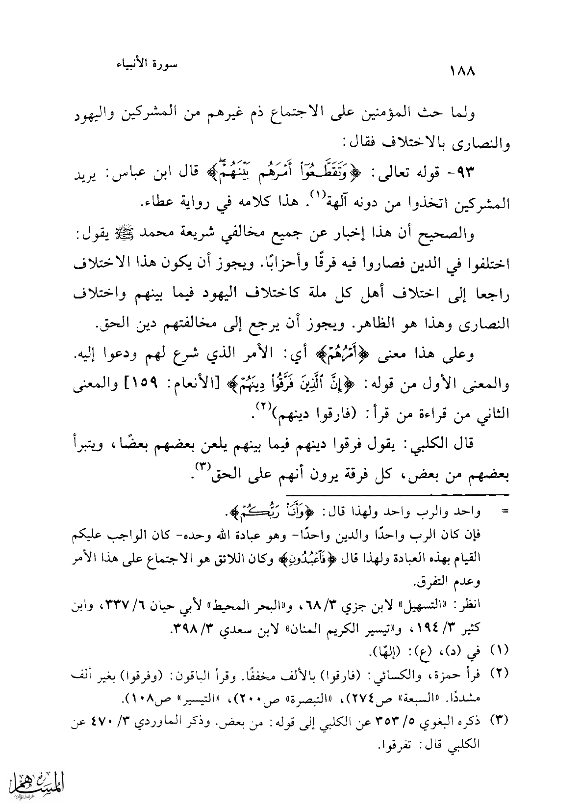 93 - قوله تعالى: {وَتَقَطَّعُوا أَمْرَهُمْ بَيْنَهُمْ} قال ابن عباس: يريد المشركين اتخذوا من دونه آلهة (¬1). هذا كلامه في رواية عطاء.