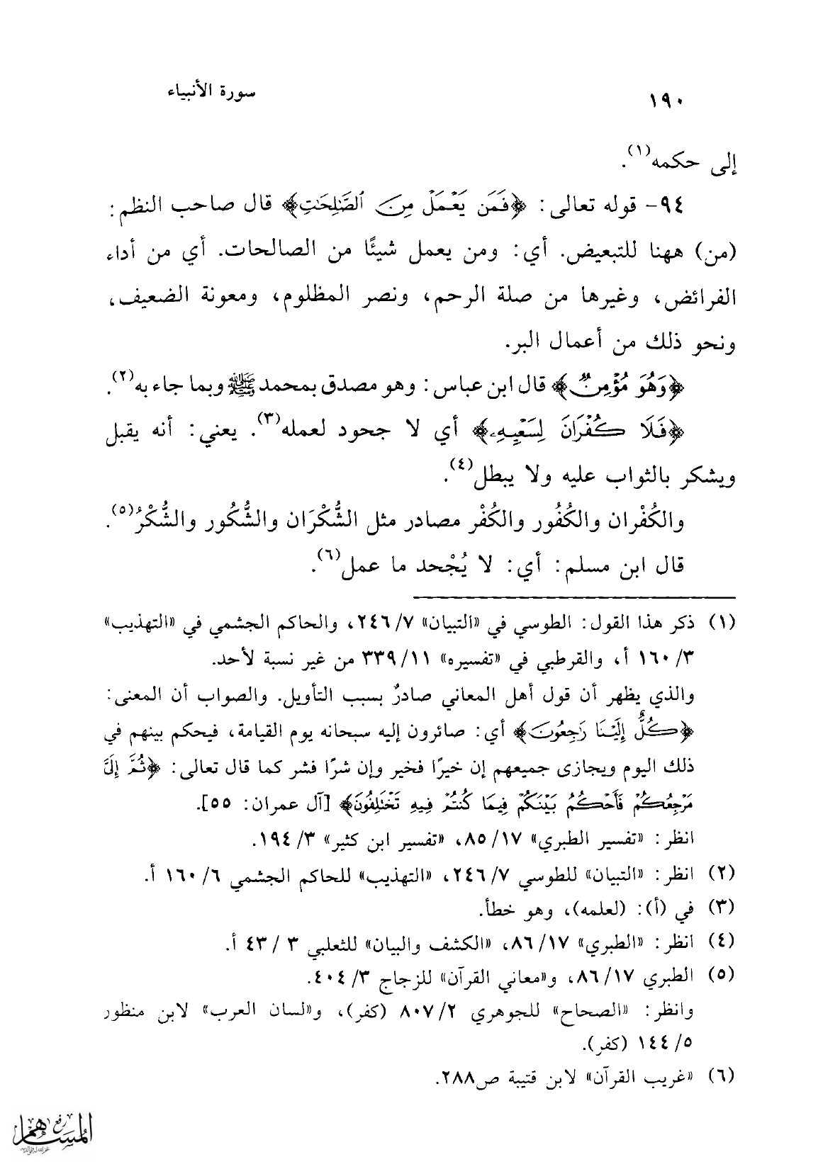 {فَلَا كُفْرَانَ لِسَعْيِهِ} أي لا جحود لعمله (¬3). يعني: أنه يقبل ويشكر بالثواب عليه ولا يبطل (¬4).