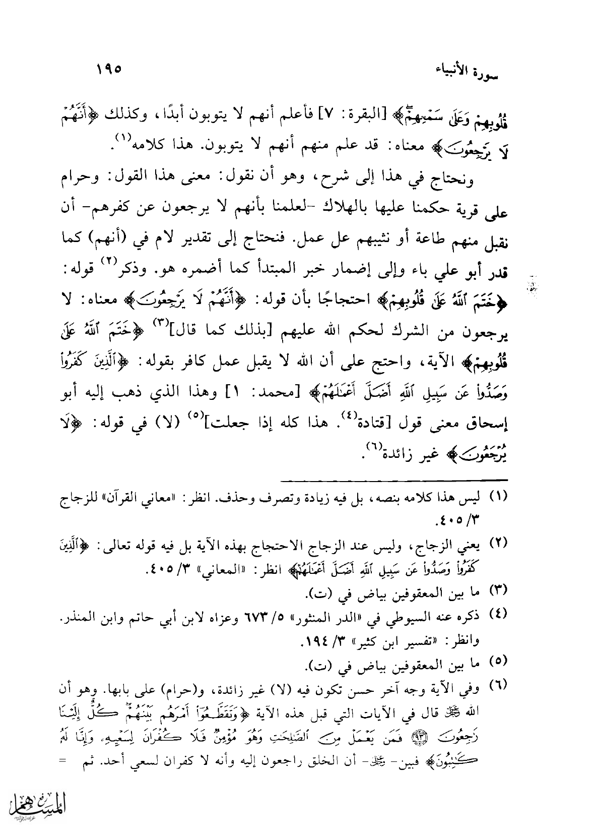 ونحتاج في هذا إلى شرح، وهو أن نقول: معنى هذا القول: وحرام على قرية حكمنا عليها بالهلاك -لعلمنا بأنهم لا يرجعون عن كفرهم- أن قبل منهم طاعة أو نثيبهم على عمل. فنحتاج إلى تقدير لام في (أنهم) كما قدر أبو علي باء وإلى إضمار خبر المبتدأ كما أضمره هو. وذكر (¬2) قوله: {خَتَمَ اللَّهُ عَلَى قُلُوبِهِمْ} احتجاجًا بأن قوله: {أَنَّهُمْ لَا يَرْجِعُونَ} معناه: لا يرجعون من الشرك لحكم الله عليهم [بذلك كما قال] (¬3) {خَتَمَ اللَّهُ عَلَى قُلُوبِهِمْ} الآية، واحتج على أن الله لا يقبل عمل كافر بقوله: {الَّذِينَ كَفَرُوا وَصَدُّوا عَنْ سَبِيلِ اللَّهِ أَضَلَّ أَعْمَالَهُمْ} [محمد:1] وهذا الذي ذهب إليه أبو إسحاق معنى قول [قتادة (¬4). هذا كله إذا جعلت] (¬5) (لا) في قوله: {لَا يَرْجِعُونَ} غير زائدة (¬6).