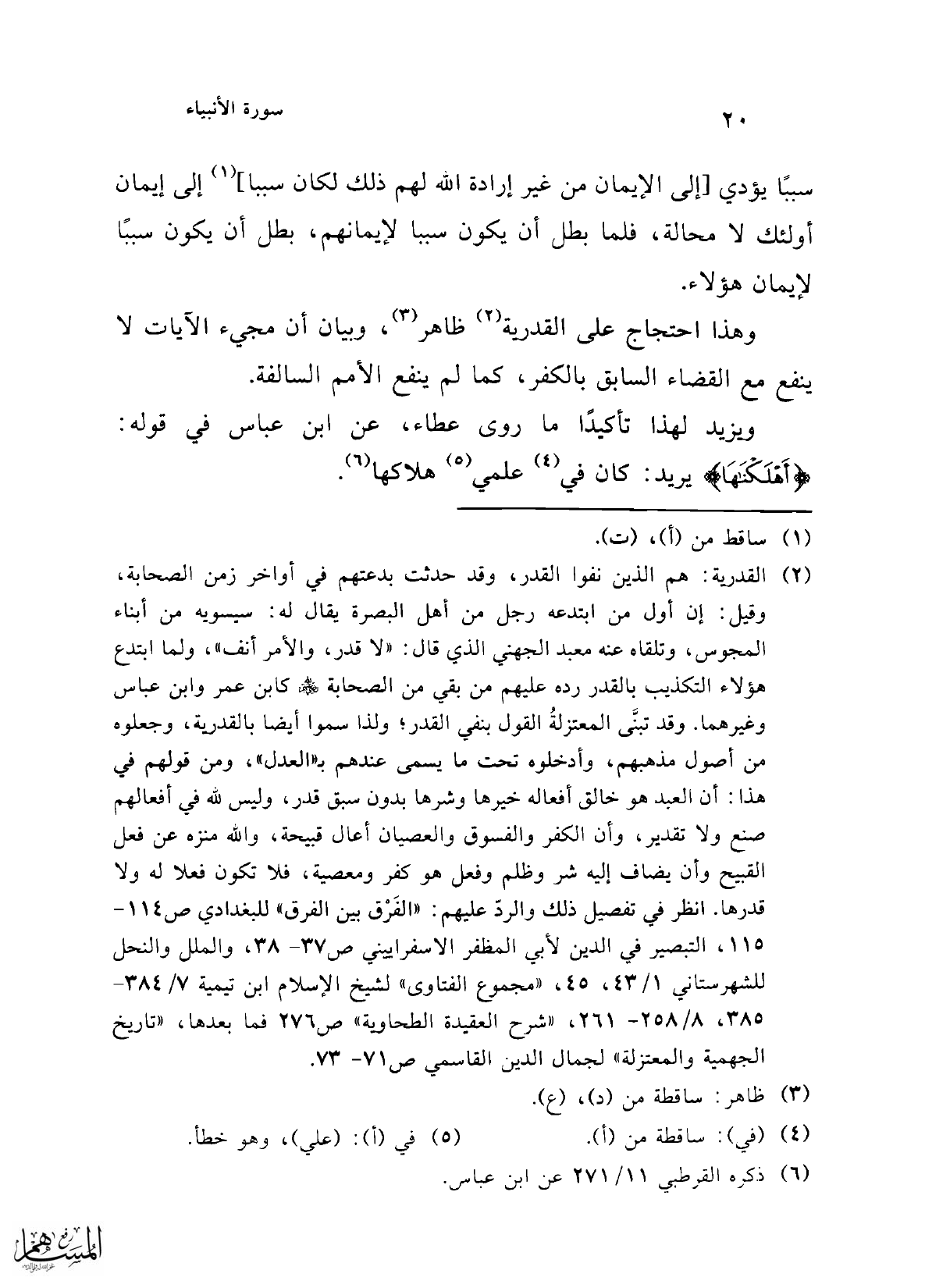 ويزيد لهذا تأكيدًا ما روى عطاء، عن ابن عباس في قوله: {أَهْلَكْنَاهَا} يريد: كان في (¬4) علمي (¬5) هلاكها (¬6).