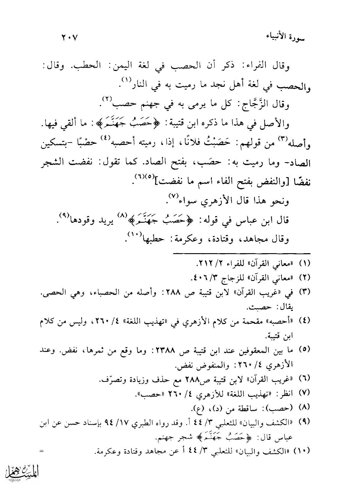 (¬9) "الكشف والبيان" للثعلبي 3/ 44 أ. وقد رواه الطبري 17/ 94 بإسناد حسن عن ابن عباس قال: {حَصَبُ جَهَنَّمَ} شجر جهنم.