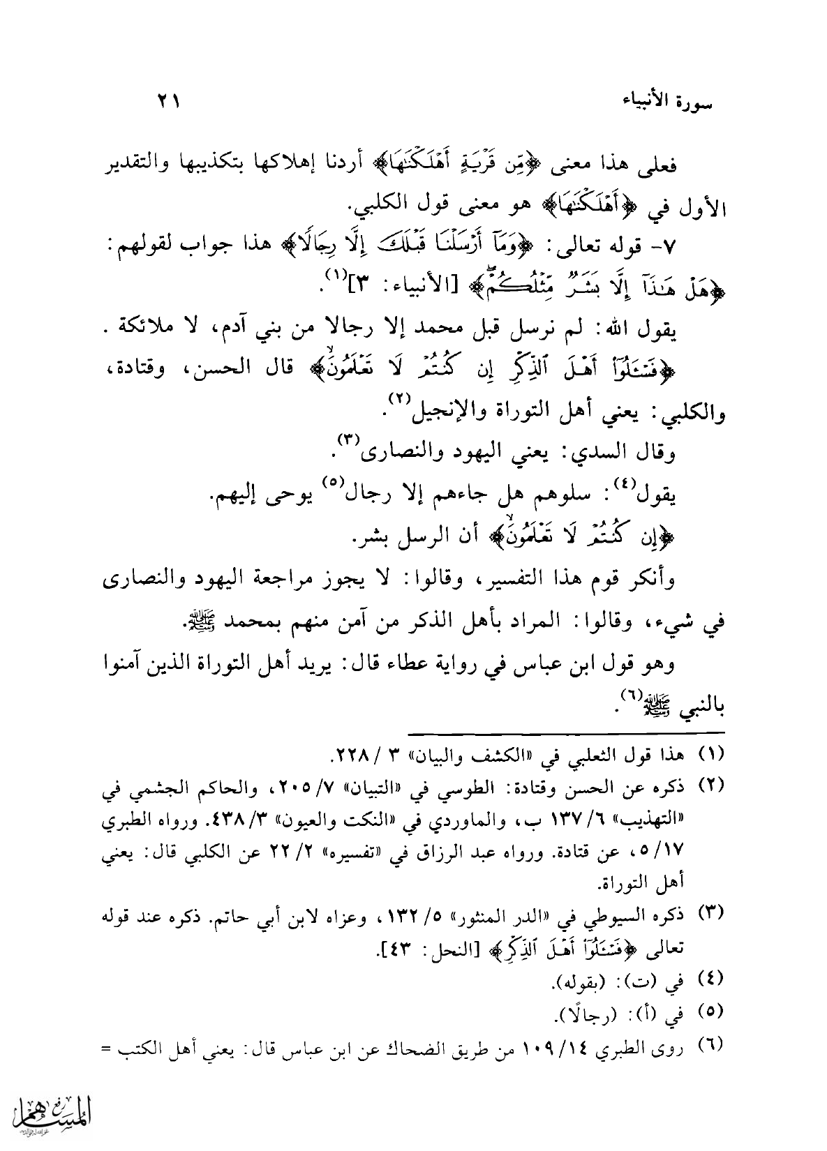 وأنكر قوم هذا التفسير، وقالوا: لا يجوز مراجعة اليهود والنصارى في شيء، وقالوا: المراد بأهل الذكر من آمن منهم بمحمد -صلى الله عليه وسلم-.