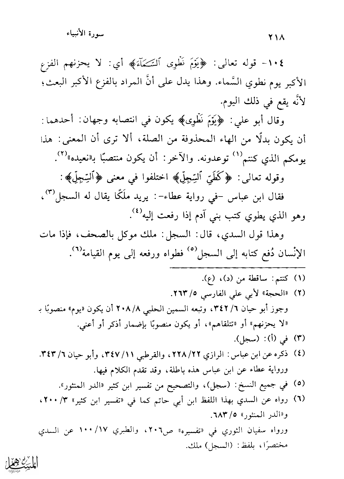 ورواه سفيان الثوري في "تفسيره" ص 206، والطبري 17/ 100 عن السدي مختصرًا، بلفظ: (السجل) ملك.
