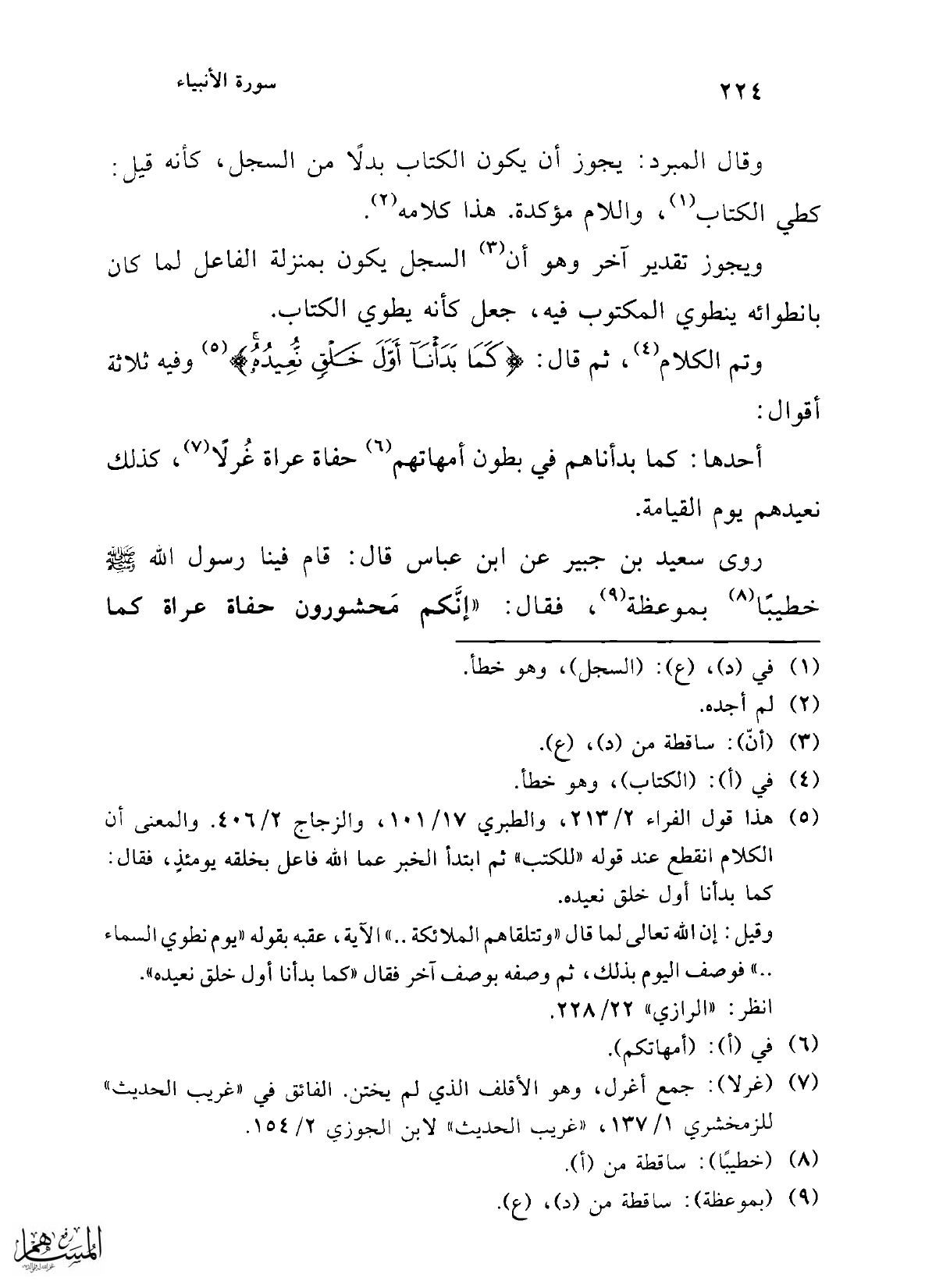 (¬5) هذا قول الفراء 2/ 213، والطبري 17/ 101، والزجاج 2/ 406. والمعنى أن الكلام انقطع عند قوله "للكتب" ثم ابتدأ الخبر عما الله فاعل بخلقه يومئذٍ، فقال: كما بدأنا أول خلق نعيده.