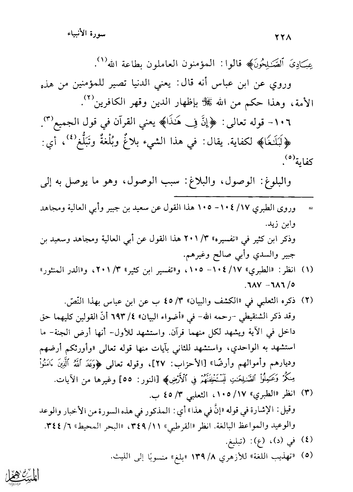 106 - قوله تعالى: {إِنَّ فِي هَذَا} يعني القرآن في قول الجميع (¬3). {لَبَلَاغًا} لكفاية. يقال: في هذا الشيء بلاغٌ وبُلْغةٌ وتَبَلُّغ (¬4)، أي: كفاية (¬5).