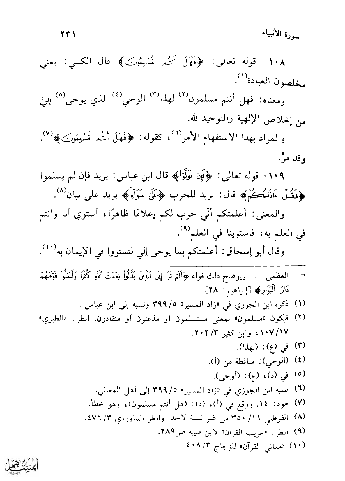 (¬2) فيكون "مسلمون" بمعنى مستسلمون أو مذعنون أو منقادون. انظر: "الطبري" 17/ 107، وابن كثير 3/ 202.