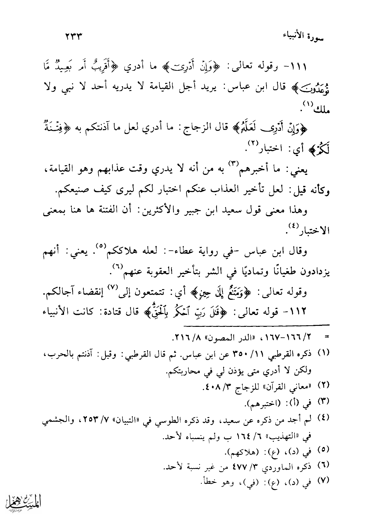 111 - وقوله تعالى: {وَإِنْ أَدْرِي} ما أدري {أَقَرِيبٌ أَمْ بَعِيدٌ مَا تُوعَدُونَ} قال ابن عباس: يريد أجل القيامة لا يدريه أحد لا نبي ولا ملك (¬1).