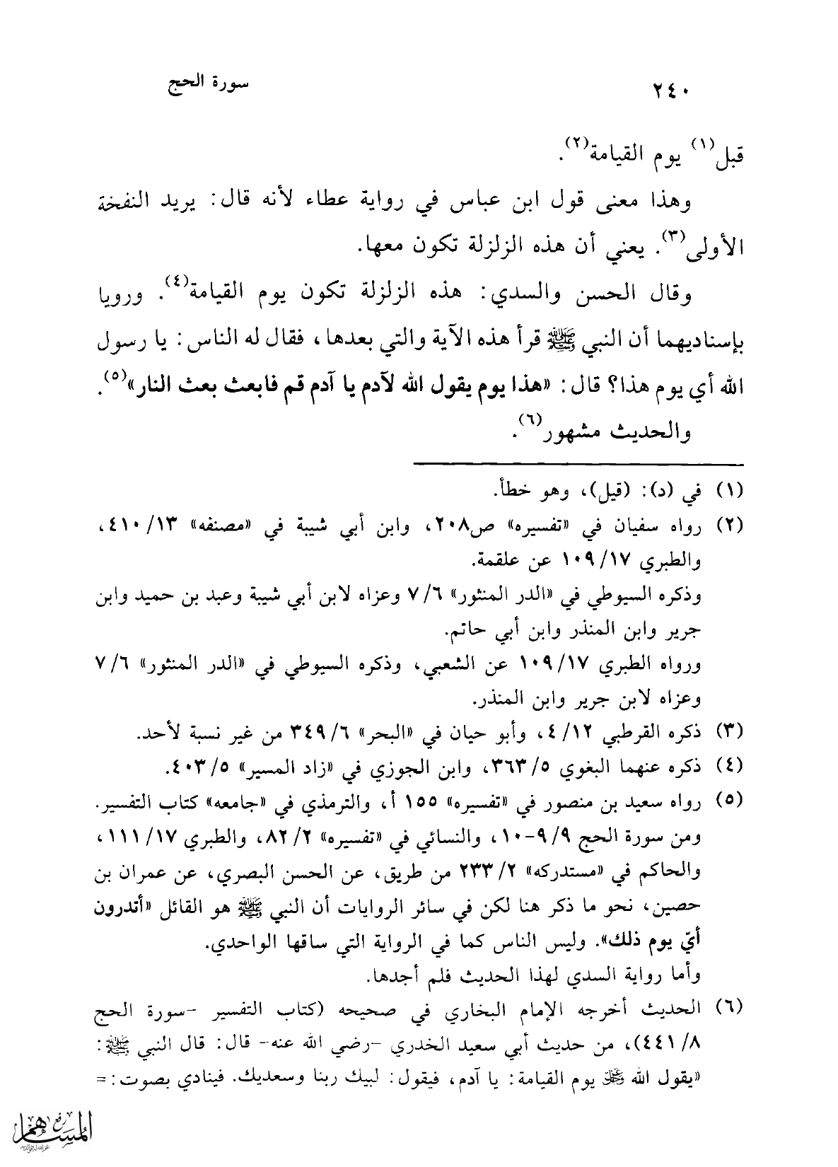 (¬5) رواه سعيد بن منصور في "تفسيره" 155 أ، والترمذي في "جامعه" كتاب التفسير. ومن سورة الحج 9/ 9 - 10، والنسائي في "تفسيره" 2/ 82، والطبري 17/ 111، والحاكم في "مستدركه" 2/ 233 من طريق، عن الحسن البصري، عن عمران بن حصين، نحو ما ذكر هنا لكن في سائر الروايات أن النبي -صلى الله عليه وسلم- هو القائل "أتدرون أيّ يوم ذلك". وليس الناس كما في الرواية التي ساقها الواحدي.