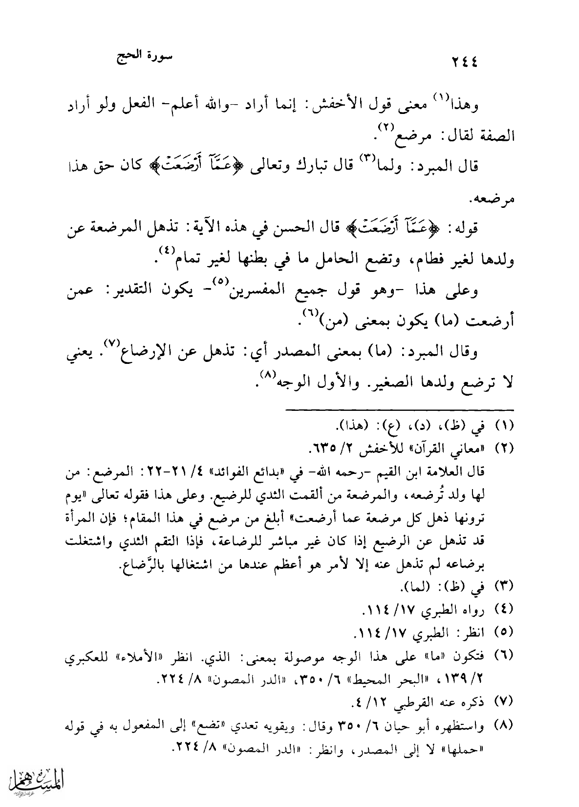 وقال المبرد: (ما) بمعنى المصدر أي: تذهل عن الإرضاع (¬7). يعني لا ترضع ولدها الصغير. والأول الوجه (¬8).