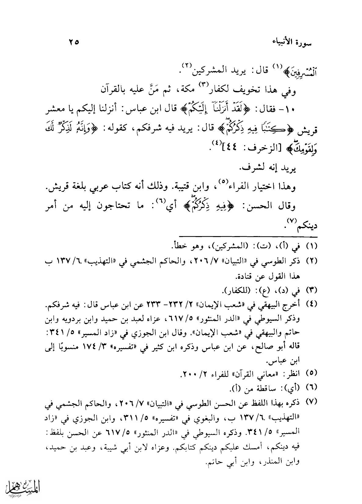 10 - فقال: {لَقَدْ أَنْزَلْنَا إِلَيْكُمْ} قال ابن عباس: أنزلنا إليكم يا معشر قريش {كِتَابًا فِيهِ ذِكْرُكُمْ} قال: يريد فيه شرفكم، كقوله: {وَإِنَّهُ لَذِكْرٌ لَكَ وَلِقَوْمِكَ} [الزخرف: 44] (¬4).