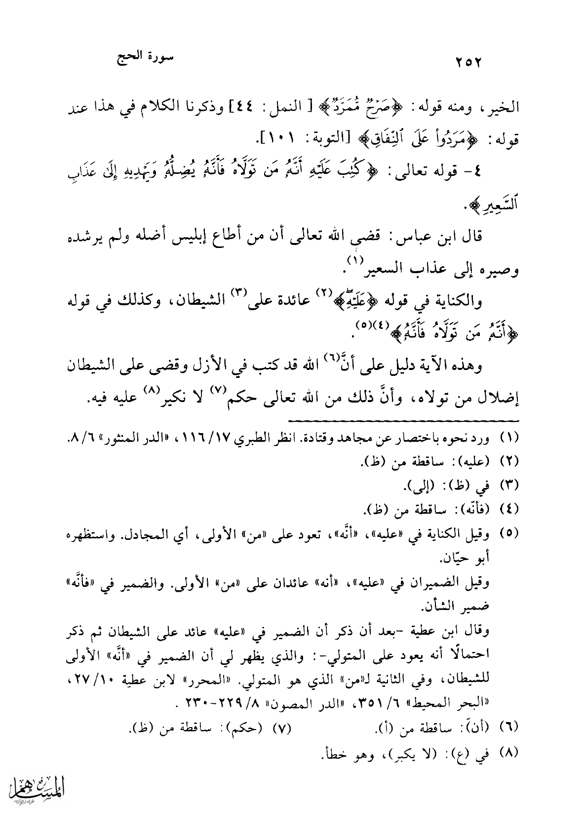 وقال ابن عطية -بعد أن ذكر أن الضمير في "عليه" عائد على الشيطان ثم ذى احتمالاً أنه يعود على المتولي-: والذي يظهر لي أن الضمير في "أنّه" الأولى للشيطان، وفي الثانية لـ"من" الذي هو المتولي. "المحرر" لابن عطية 10/ 27، "البحر المحيط" 6/ 351، "الدر المصون" 8/ 229 - 230.
