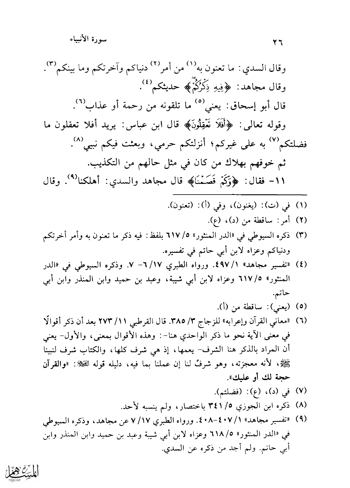(¬9) "تفسير مجاهد" 1/ 407 - 408 ورواه الطبري 17/ 7 عن مجاهد، وذكره السيوطي في "الدر المنثور" 5/ 618 وعزاه لابن أبي شيبة وعبد بن حميد وابن المنذر وابن أبي حاتم. ولم أجد من ذكره عن السدي.
