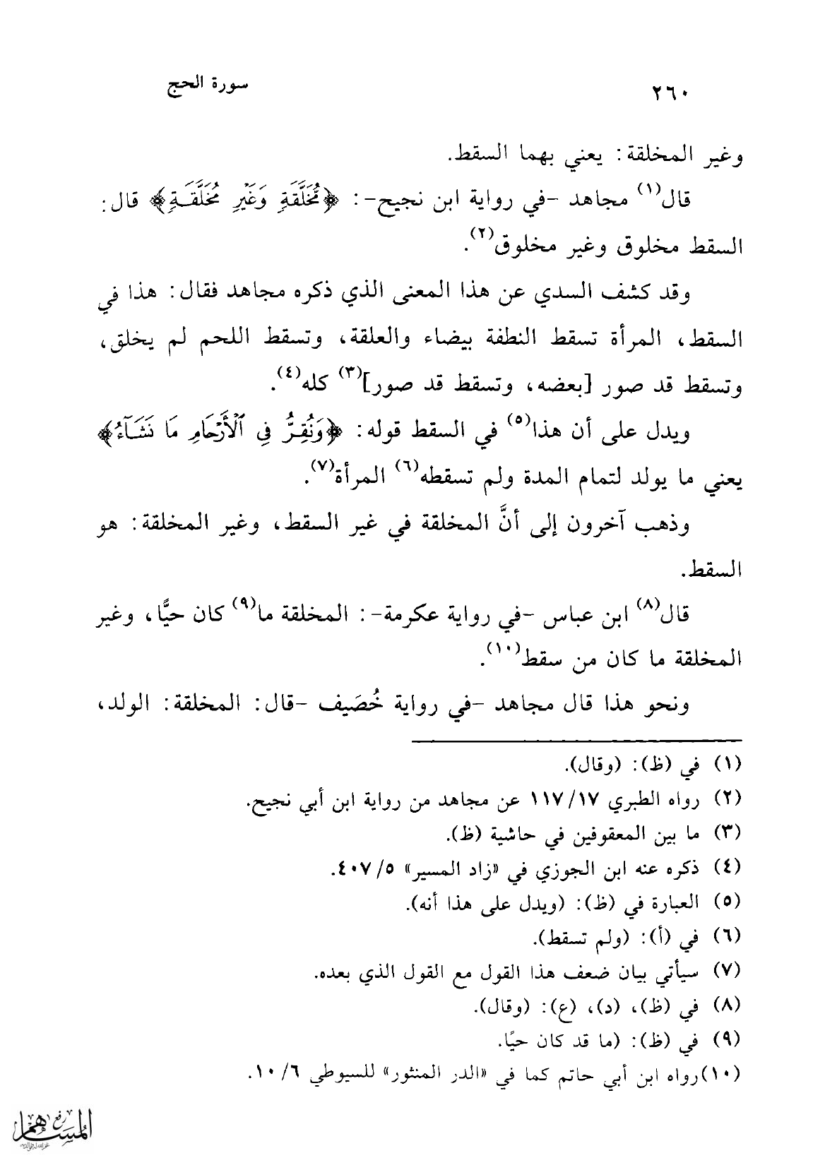قال (¬1) مجاهد -في رواية ابن نجيح- {مُخَلَّقَةٍ وَغَيْرِ مُخَلَّقَةٍ} قال: السقط مخلوق وغير مخلوق (¬2).