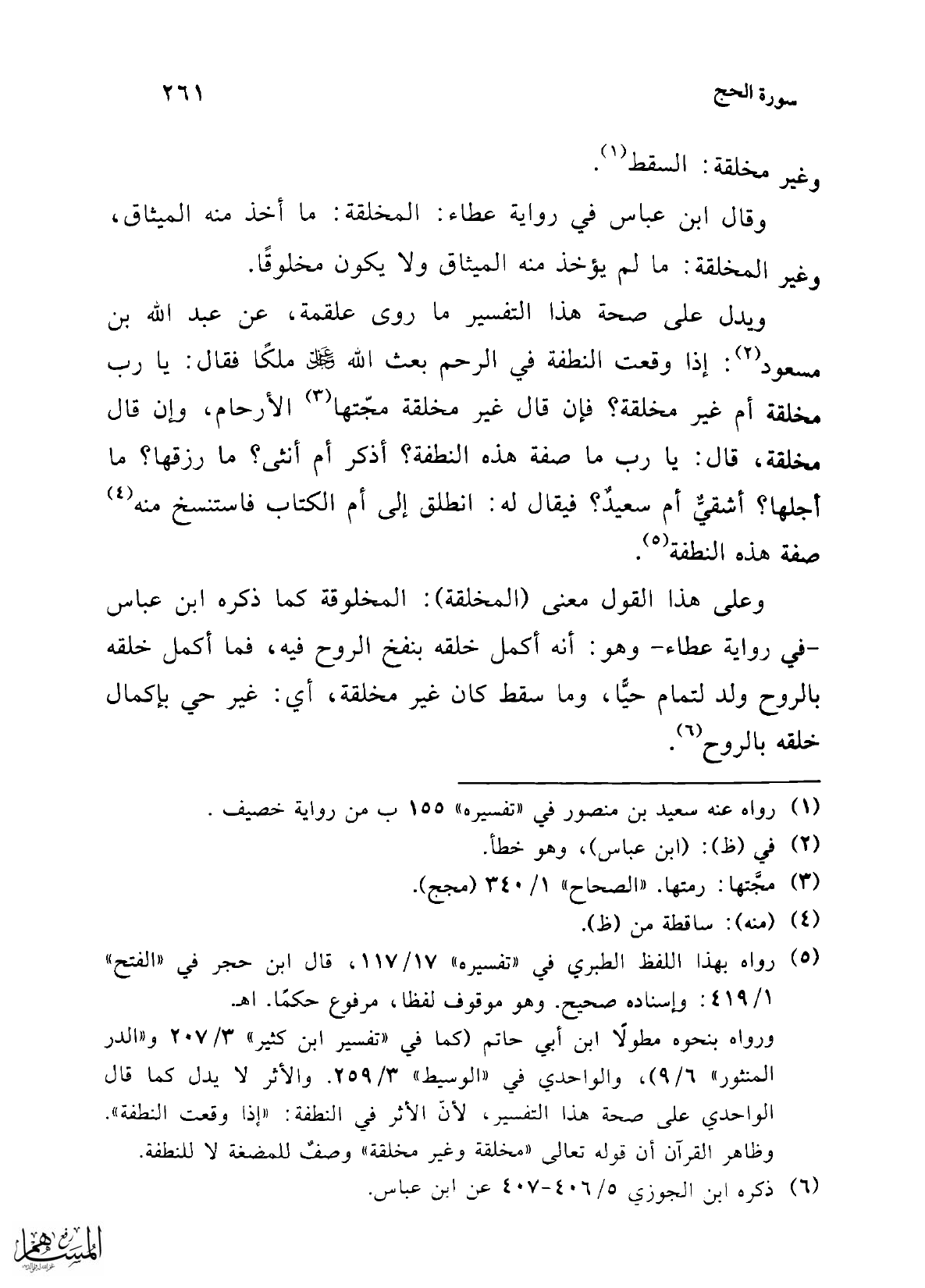 ورواه بنحوه مطولاً ابن أبي حاتم (كما في "تفسير ابن كثير" 3/ 207 و"الدر المنثور" 6/ 9)، والواحدي في "الوسيط" 3/ 259. والأثر لا يدل كما قال الواحدي على صحة هذا التفسير؛ لأنّ الأثر في النطفة: "إذا وقعت النطفة". وظاهر القرآن أن قوله تعالى "مخلقة وغير مخلقة" وصفٌ للمضغة لا للنطفة.