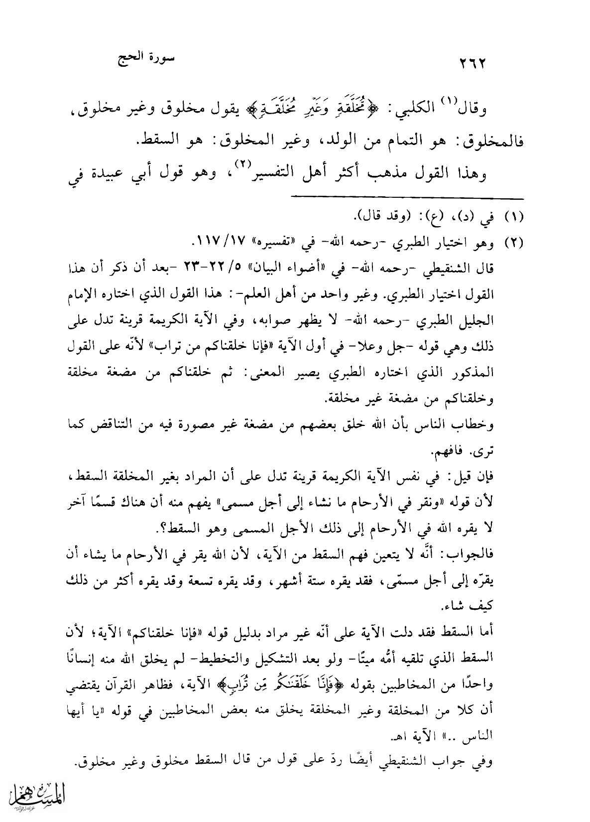 قال الشنقيطي -رحمه الله- في "أضواء البيان" 5/ 22 - 23 - بعد أن ذكر أن هذا القول اختيار الطبري. وغير واحد من أهل العلم-: هذا القول الذي اختاره الإمام الجليل الطبري -رحمه الله- لا يظهر صوابه، وفي الآية الكريمة قرينة تدل على ذلك وهي قوله -جل وعلا- في أول الآية "فإنا خلقناكم من تراب" لأنّه على القول المذكور الذي اختاره الطبري يصير المعنى: ثم خلقناكم من مضغة مخلقة وخلقناكم من مضغة غير مخلقة.