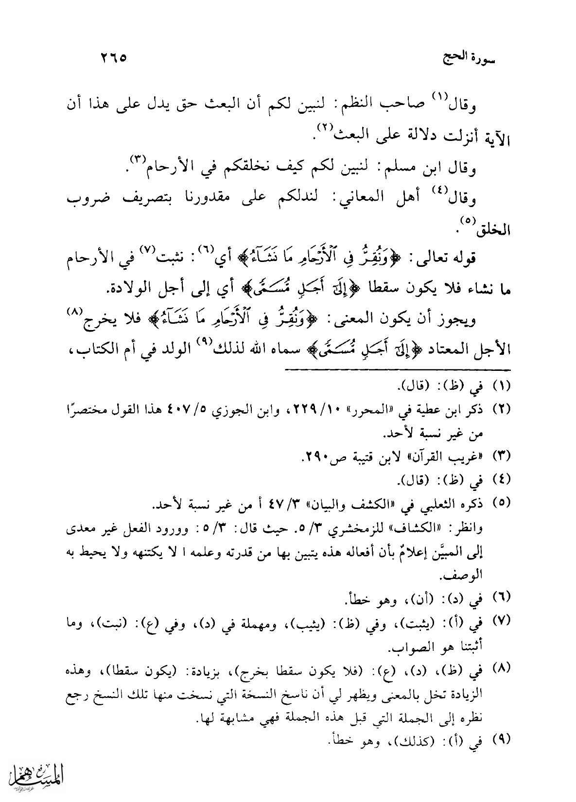 ويجوز أن يكون المعنى: {وَنُقِرُّ فِي الْأَرْحَامِ مَا نَشَاءُ} فلا يخرج (¬8) الأجل المعتاد {إِلَى أَجَلٍ مُسَمًّى} سماه الله لذلك (¬9) الولد في أم الكتاب،