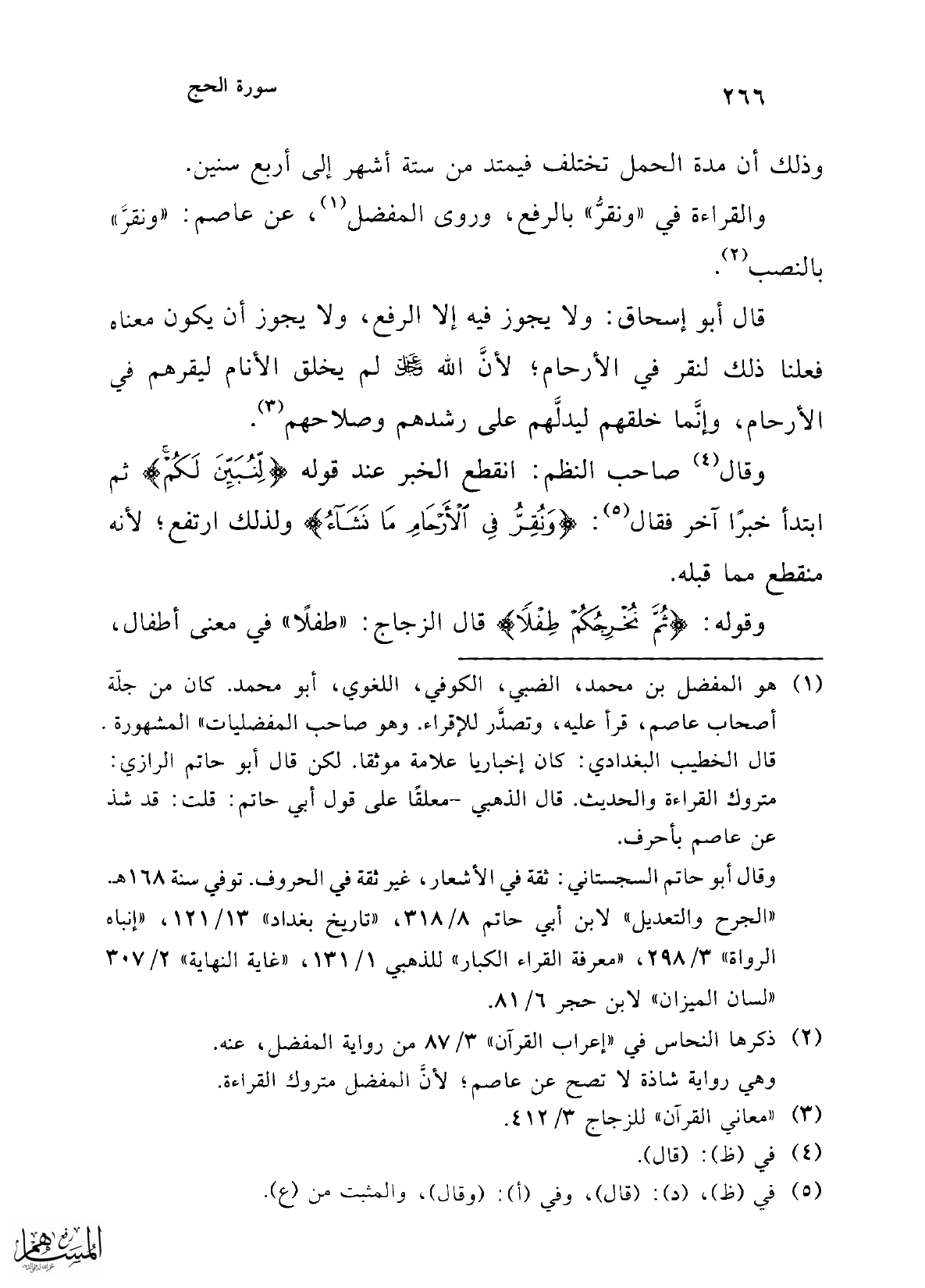 قال أبو إسحاق: ولا يجوز فيه إلا الرفع، ولا يجوز أن يكون معناه فعلنا ذلك لنقر في الأرحام؛ لأنَّ الله -عَزَّ وَجَلَّ- لم يخلق الأنام ليقرهم في الأرحام، وإنَّما خلقهم ليدلَّهم على رشدهم وصلاحهم (¬3).
