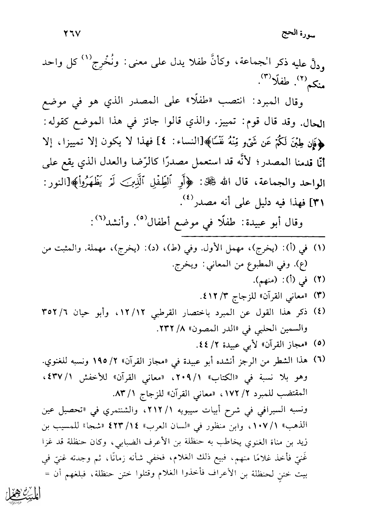وقال المبرد: انتصب "طفلاً" على المصدر الذي هو في موضع الحال. وقد قال قوم: تمييز. والذي قال جائز في هذا الموضع كقوله: {فَإِنْ طِبْنَ لَكُمْ عَنْ شَيْءٍ مِنْهُ نَفْسًا} [النساء: 4] فهذا لا يكون إلا تمييزا، إلا أنّا قدمنا المصدر؛ لأنَّه قد استعمل مصدرًا كالرّضا والعدل الذي يقع على الواحد والجماعة، قال الله -عَزَّ وَجَلَّ-: {أَوِ الطِّفْلِ الَّذِينَ لَمْ يَظْهَرُوا} [النور: 31] فهذا فيه دليل على أنه مصدر (¬4).