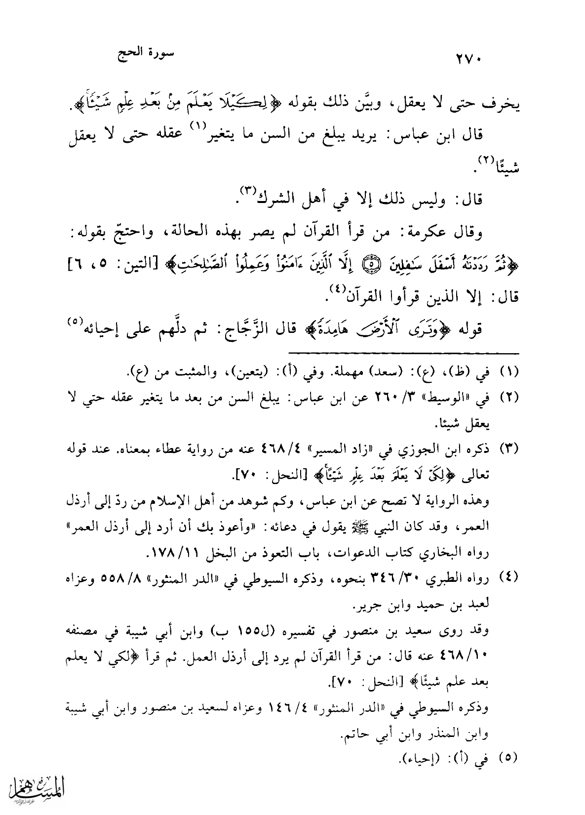 (¬2) في "الوسيط" 3/ 260 عن ابن عباس: يبلغ السن من بعد ما يتغير عقله حتي لا يعقل شيئا.