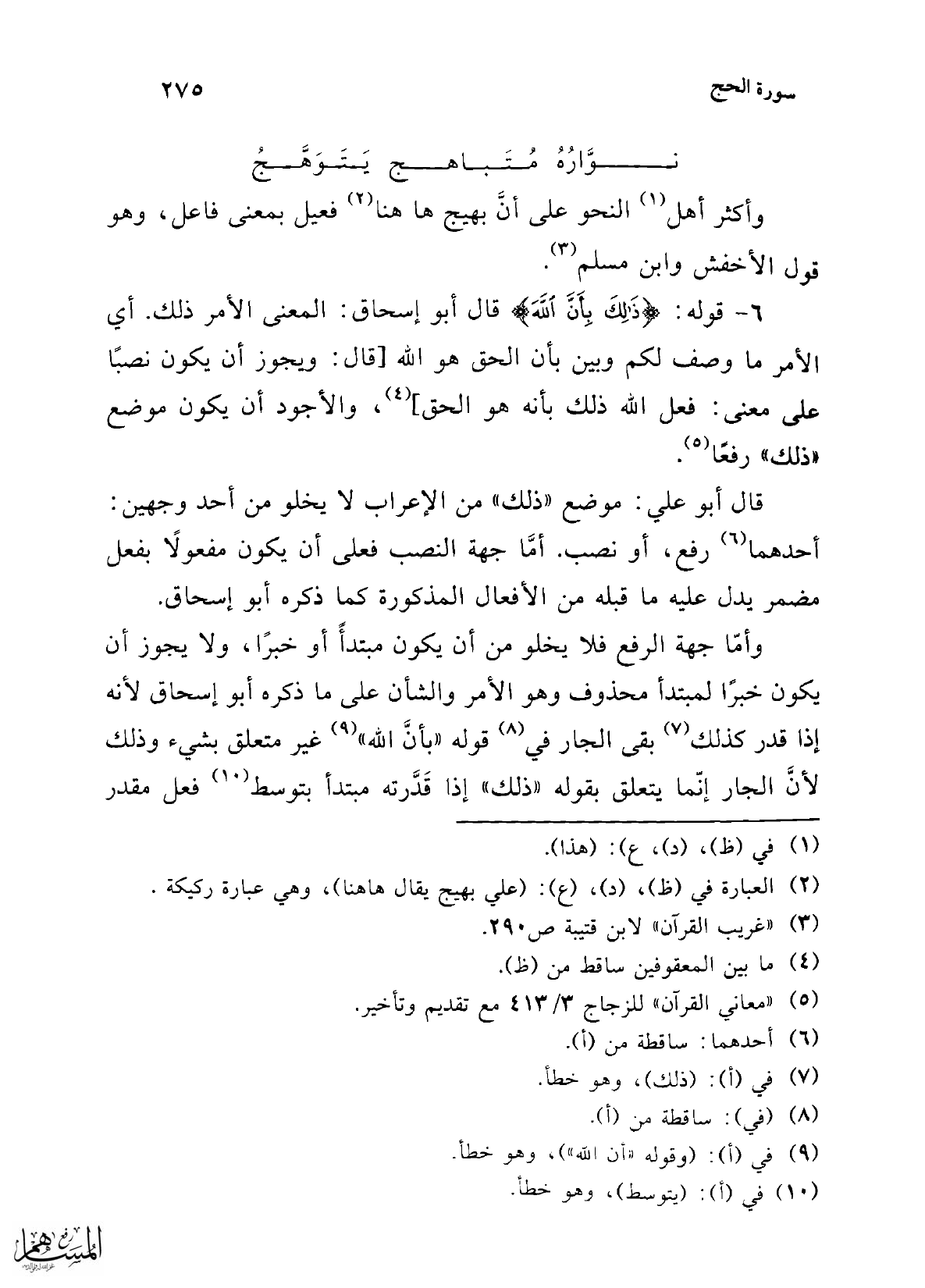 6 - قوله: {ذَلِكَ بِأَنَّ اللَّهَ} قال أبو إسحاق: المعنى الأمر ذلك. أي الأمر ما وصف لكم وبين بأن الحق هو الله [قال: ويجوز أن يكون نصبًا علي معنى: فعل الله ذلك بأنه هو الحق] (¬4)، والأجود أن يكون موضع "ذلك" رفعًا (¬5).