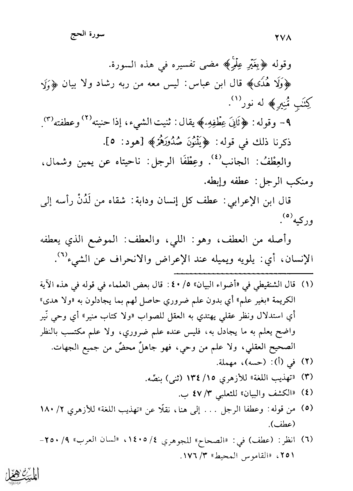 9 - وقوله: {ثَانِيَ عِطْفِهِ} يقال: ثنيت الشيء، إذا حنيته (¬2) وعطفته (¬3).