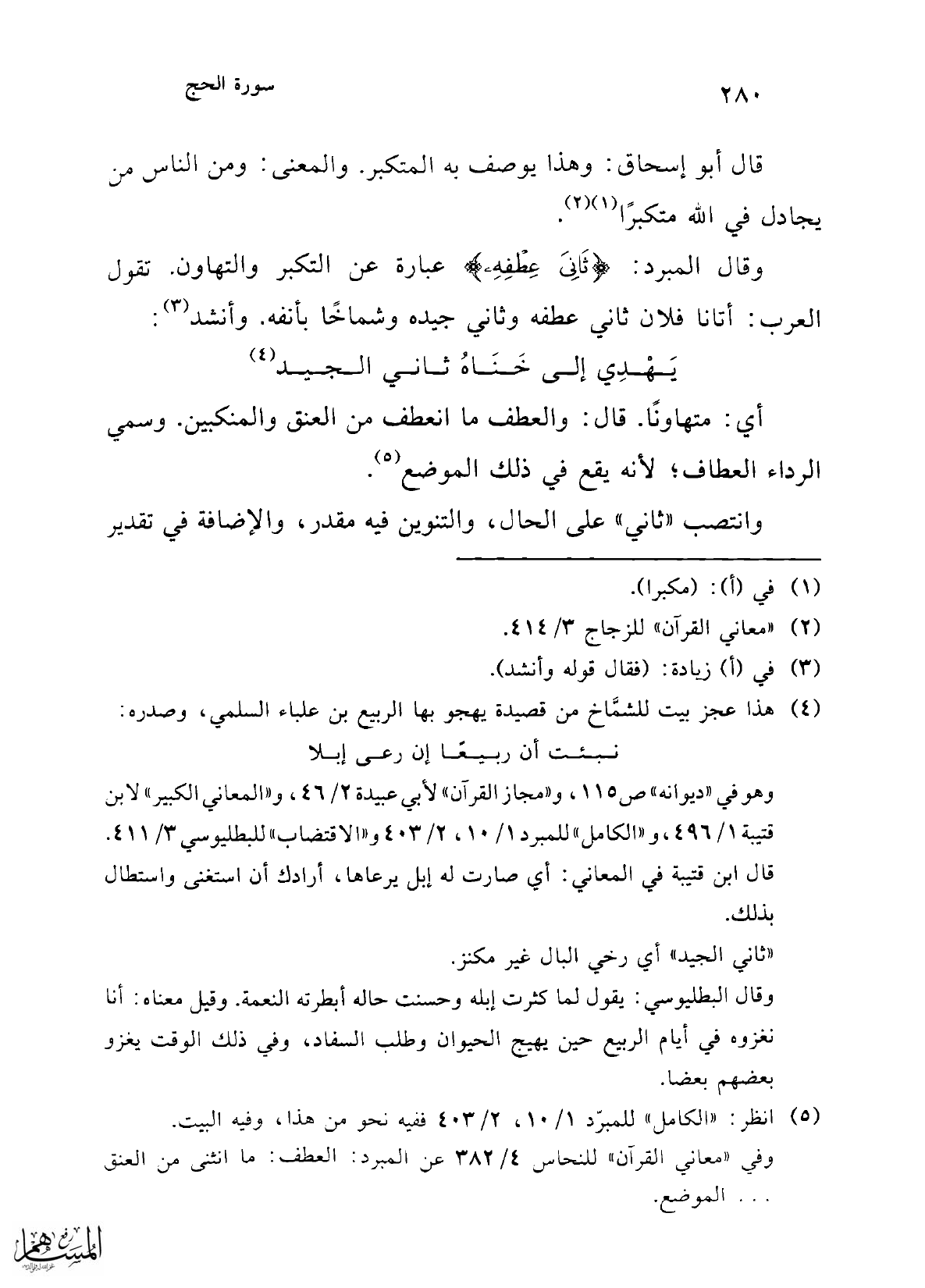وقال المبرد: {ثَانِيَ عِطْفِهِ} عبارة عن التكبر والتهاون. تقول العرب: أتانا فلان ثاني عطفه وثاني جيده وشماخًا بأنفه. وأنشد (¬3):