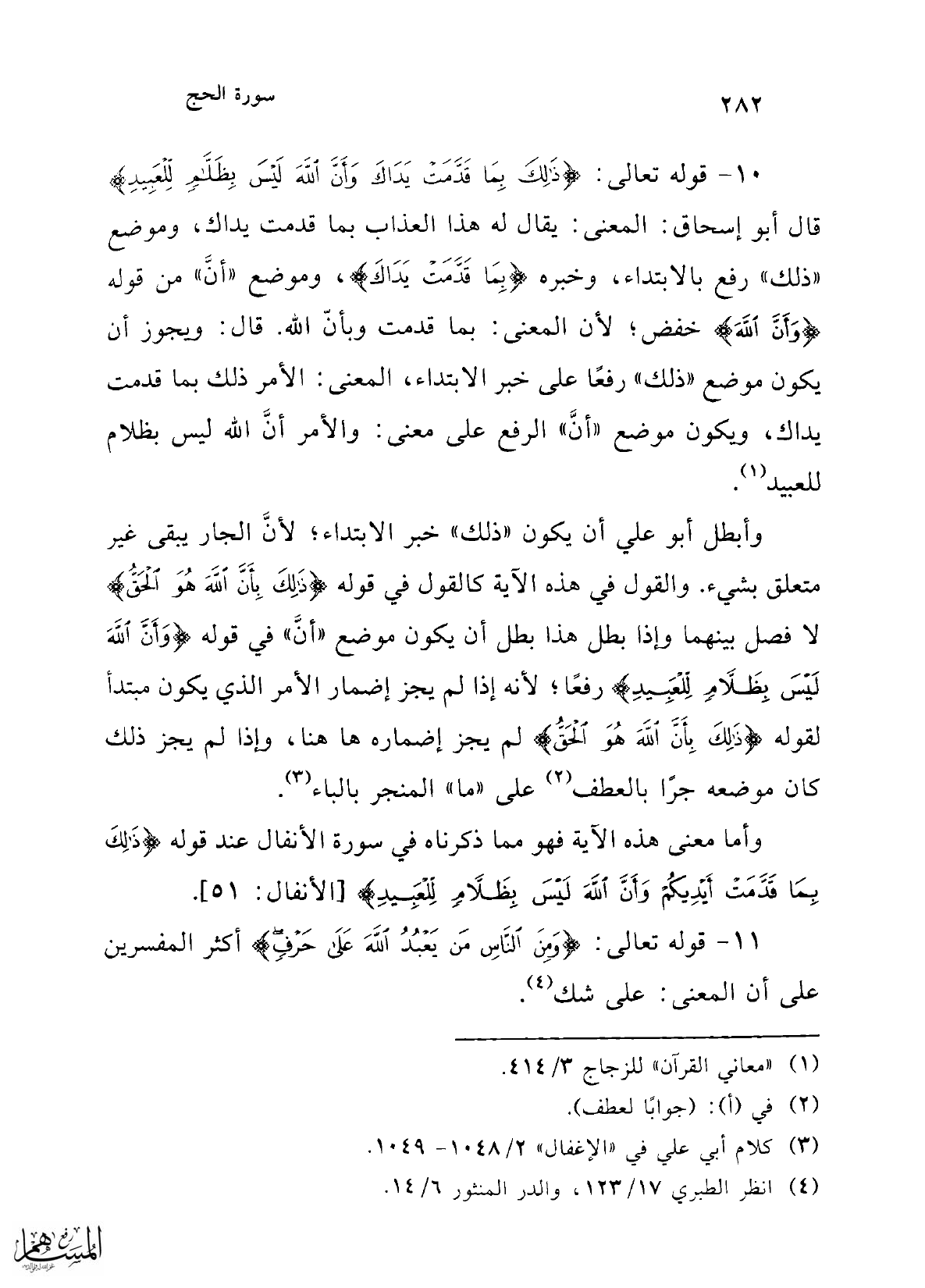 10 - قوله تعالى: {ذَلِكَ بِمَا قَدَّمَتْ يَدَاكَ وَأَنَّ اللَّهَ لَيْسَ بِظَلَّامٍ لِلْعَبِيدِ} قال أبو إسحاق: المعنى: يقال له هذا العذاب بما قدمت يداك، وموضع "ذلك" رفع بالابتداء، وخبره {بِمَا قَدَّمَتْ يَدَاكَ}، وموضع "أنَّ" من قوله {وَأَنَّ اللَّهَ} خفض؛ لأن المعنى: بما قدمت وبأنّ الله. قال: ويجوز أن يكون موضع "ذلك" رفعًا على خبر الابتداء، المعنى: الأمر ذلك بما قدمت يداك، ويكون موضع "أنَّ" الرفع على معنى: والأمر أنَّ الله ليس بظلام للعبيد (¬1).