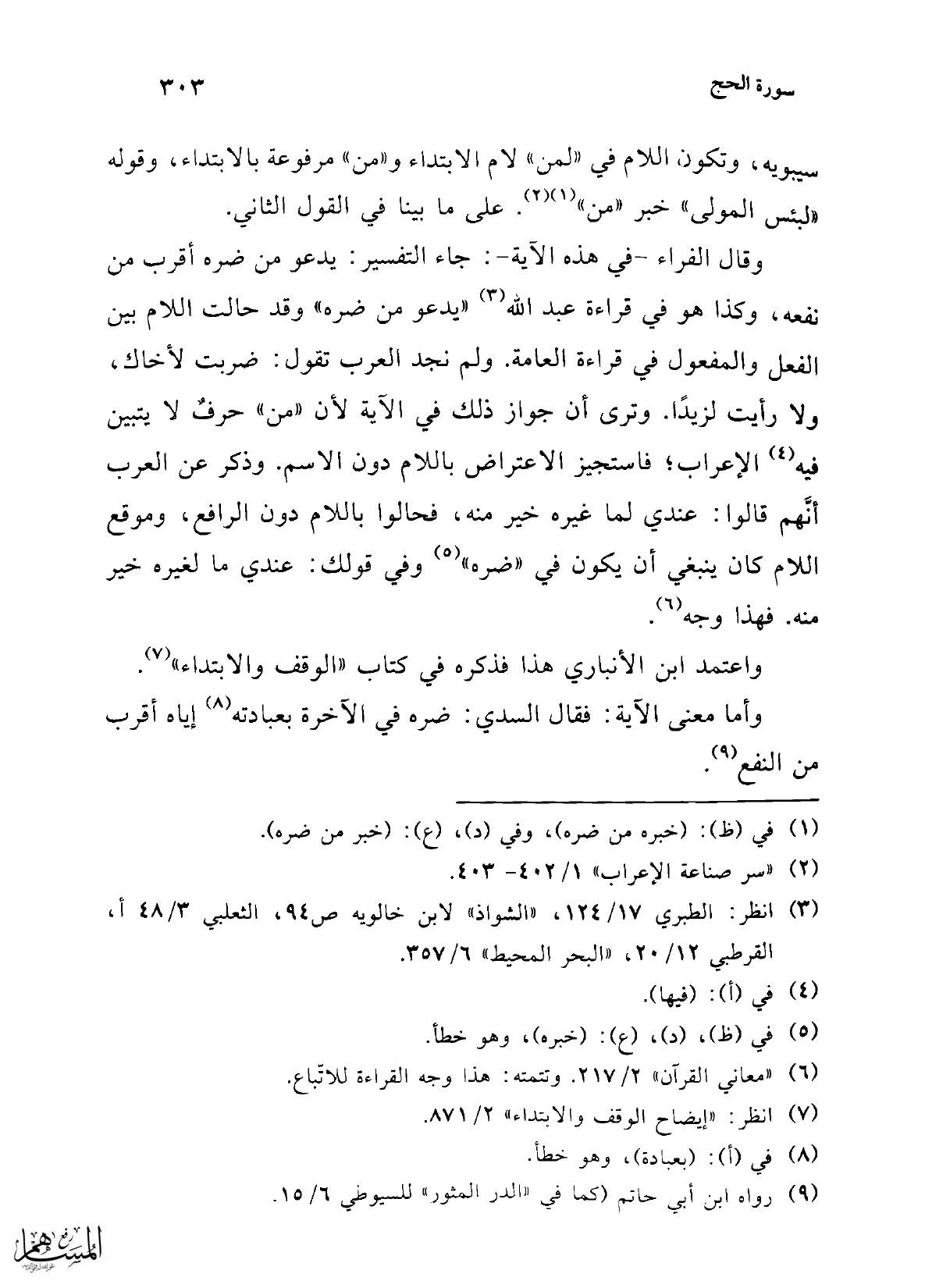 وقال الفراء -في هذه الآية-: جاء التفسير: يدعو من ضره أقرب من نفعه، وكذا هو في قراءة عبد الله (¬3) "يدعو من ضره" وقد حالت اللام بين الفعل والمفعول في قراءة العامة. ولم نجد العرب تقول: ضربت لأخاك، ولا رأيت لزيدًا. وترى أن جواز ذلك في الآية لأن "من" حرفٌ لا يتبين فيه (¬4) الإعراب؛ فاستجيز الاعتراض باللام دون الاسم. وذكر عن العرب أنَّهم قالوا: عندي لما غيره خير منه، فحالوا باللام دون الرافع، وموقع اللام كان ينبغي أن يكون في "ضره" (¬5) وفي قولك: عندي ما لغيره خير منه. فهذا وجه (¬6).