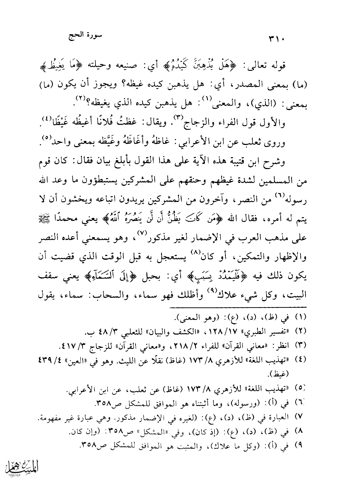 قوله تعالى: {هَلْ يُذْهِبَنَّ كَيْدُهُ} أي: صنيعه وحيلته {مَا يَغِيظُ} (ما) بمعنى المصدر، أي: هل يذهبن كيده غيظه؟ ويجوز أن يكون (ما) بمعنى: (الذي)، والمعنى (¬1): هل يذهبن كيده الذي يغيظه؟ (¬2).