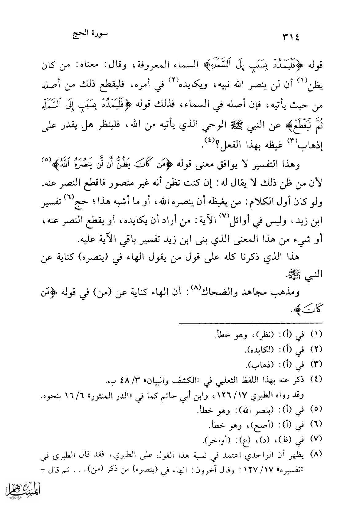 وهذا التفسير لا يوافق معنى قوله {مَنْ كَانَ يَظُنُّ أَنْ لَنْ يَنْصُرَهُ اللَّهُ} (¬5) لأن من ظن ذلك لا يقال له: إن كنت تظن أنه غير منصور فاقطع النصر عنه. ولو كان أول الكلام: من يغيظه أن ينصره الله، أو ما أشبه هذا؛ حج (¬6) تفسير ابن زيد، وليس في أوائل (¬7) الآية: من أراد أن يكايده، أو يقطع النصر عنه، أو شيء من هذا المعنى الذي بني ابن زيد تفسير باقي الآية عليه.