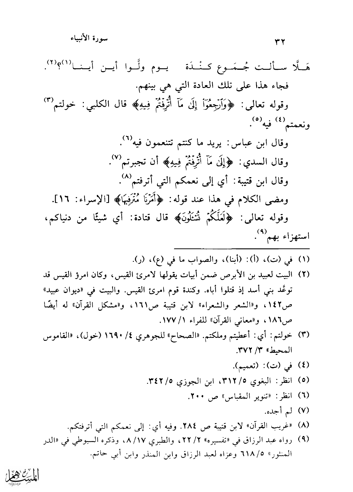 (¬8) "غريب القرآن" لابن قتيبة ص 284. وفيه أي: إلى نعمكم التي أترفتكم.