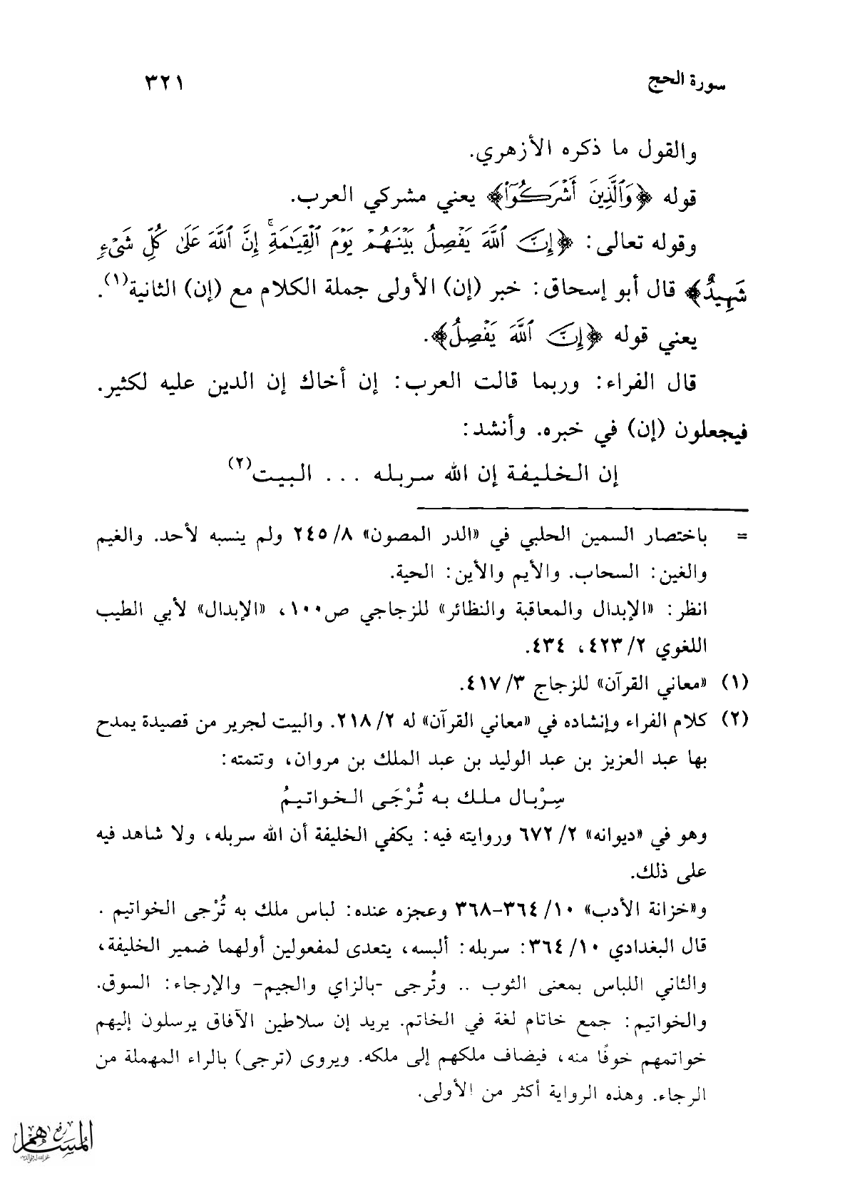 وقوله تعالى: {إِنَّ اللَّهَ يَفْصِلُ بَيْنَهُمْ يَوْمَ الْقِيَامَةِ إِنَّ اللَّهَ عَلَى كُلِّ شَيْءٍ شَهِيدٌ} قال أبو إسحاق: خبر (إن) الأولى جملة الكلام مع (إن) الثانية (¬1).