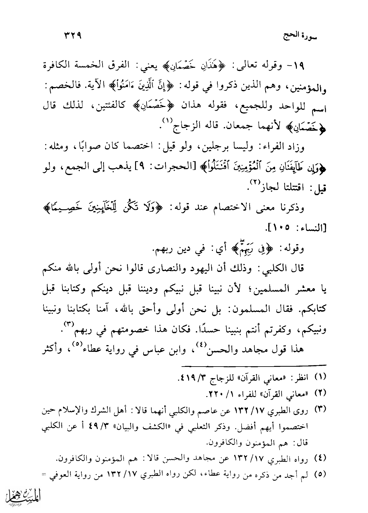 19 - وقوله تعالى: {هَذَانِ خَصْمَانِ} يعني: الفرق الخمسة الكافرة والمؤمنين، وهم الذين ذكروا في قوله: {إِنَّ الَّذِينَ آمَنُوا} الآية. فالخصم: اسم للواحد وللجميع، فقدله هذان {خَصْمَانِ} كالفئتين، لذلك قال {خَصْمَانِ} لأنهما جمعان. قاله الزجاج (¬1).