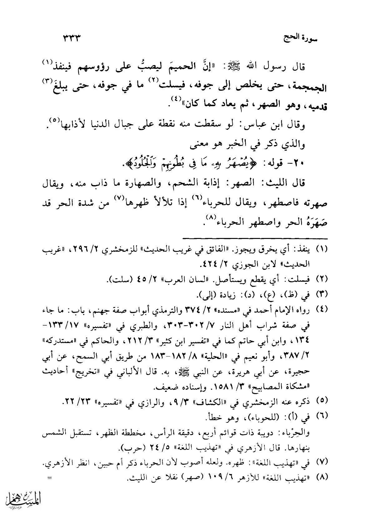 (¬4) رواه الإمام أحمد في "مسنده" 2/ 374 والترمذي أبواب صفة جهنم، باب: ما جاء في صفة شراب أهل النار 7/ 302 - 303، والطبري في "تفسيره" 17/ 133 - 134، وابن أبي حاتم كما في "تفسير ابن كثير" 3/ 212، والحاكم في "مستدركه" 2/ 387، وأبو نعيم في "الحلية" 8/ 182 - 183 من طريق أبي السمح، عن أبي حجيرة، عن أبي هريرة، عن النبي -صلى الله عليه وسلم-، به. قال الألباني في "تخريج" أحاديث "مشكاة المصابيح" 3/ 1581. وإسناده ضعيف.