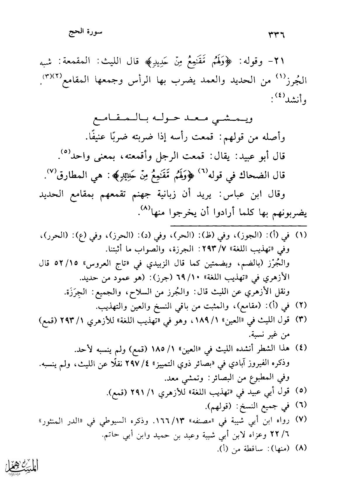 21 - وقوله: {وَلَهُمْ مَقَامِعُ مِنْ حَدِيدٍ} قال الليث: المقمعة: شبه الجُرز (ا) من الحديد والعمد يضرب بها الرأس وجمعها المقامع (¬2) (¬3). وأنشد (¬4):
